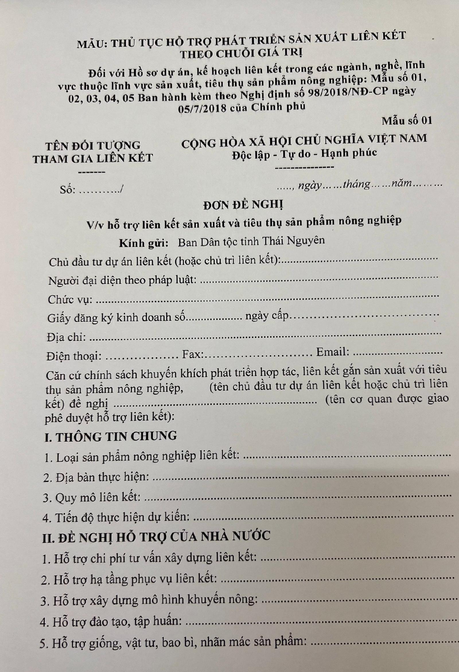 thành phần hồ sơ dự án, kế hoạch liên kết dự án hỗ trợ phát triển sản xuất theo chuỗi giá trị thuộc Chương trình MTQG phát triển kinh tế-xã hội vùng đồng bào dân tộc thiểu số và miền núi trên địa bàn tỉnh Thái Nguyên