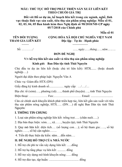 Mẫu Hồ sơ dự án, kế hoạch liên kết dự án hỗ trợ phát triển sản xuất theo chuỗi giá trị