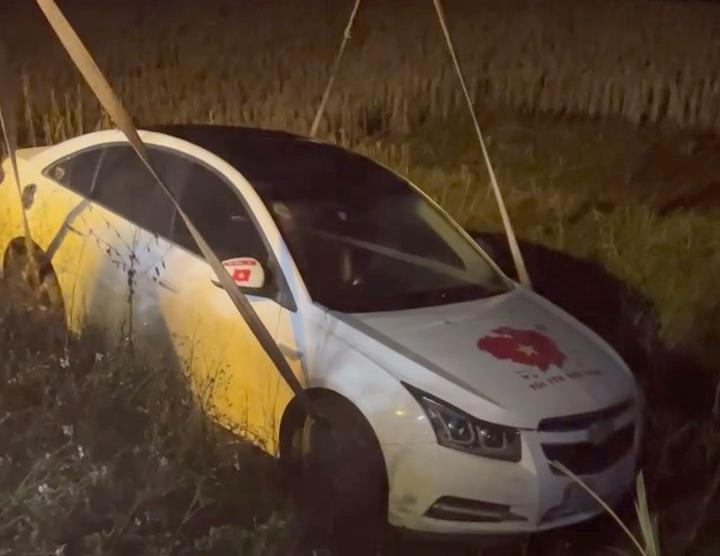 Lùi xe tránh chốt kiểm tra nồng độ cồn, ô tô lao xuống ruộng