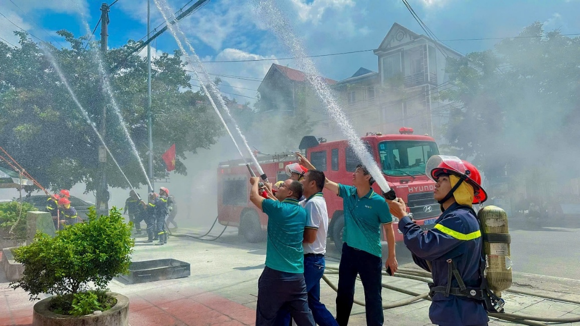 Các lực lượng thực tập PCCC và CNCH tại Ngân hàng BIDV Nam Thái Nguyên