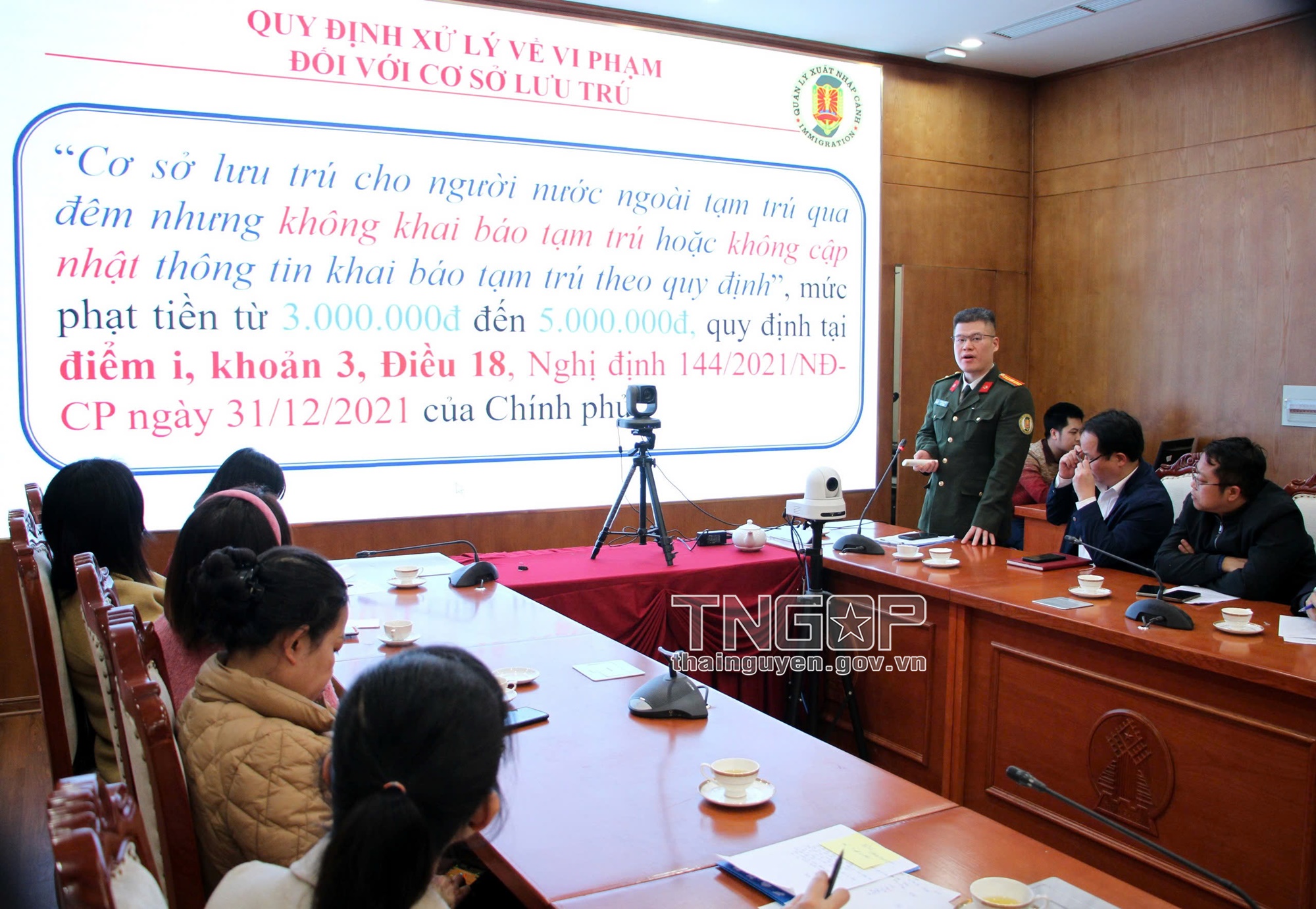 Tại buổi tuyên truyền, cán bộ Phòng Quản lý XNC đã thông tin, chuyên đề, phổ biến, hướng dẫn việc thực hiện các quy định của pháp luật trong lĩnh vực quản lý XNC, trọng tâm là Luật số 23/2023/QH15 của Quốc hội sửa đổi, bổ sung một số điều của Luật Xuất cảnh, nhập cảnh của công dân Việt Nam và Luật Nhập cảnh, xuất cảnh, quá cảnh, cư trú của người nước ngoài tại Việt Nam; Thông tư số 53/2016/TT-BCA của Bộ Công an quy định cách thức thực hiện khai báo, tiếp nhận thông tin tạm trú của người nước ngoài tại Việt Nam. Các đại biểu cũng được hướng dẫn nộp hồ sơ đề nghị cấp hộ chiếu phổ thông trực tuyến ở trong nước; tuyên truyền những quy định về xử phạt vi phạm hành chính đối với người nước ngoài; các quy định liên quan đến phân công, phân cấp và quy trình quản lý người nước ngoài; xử lý vi phạm hành chính đối với cơ sở lưu trú, người nước ngoài lưu trú trên địa bàn vi phạm; hoạt động hợp tác quốc tế trong phòng, chống tội phạm, tội phạm sử dụng công nghệ cao, tội phạm trong lĩnh vực XNC...