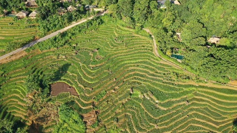 Tháng Sáu, khi cái nắng miền xuôi nung nấu mặt đường, cũng là lúc Pù Luông bước vào mùa rực rỡ trong năm. Những thửa ruộng bậc thang trải dài như bản đồ mùa vụ được dệt bởi bàn tay của bao thế hệ. Không còi xe, không vết chắp vá đô thị hóa, thung lũng hiện ra tinh khôi, như mảng không gian còn nguyên vẹn giữa đời sống tấp nập.