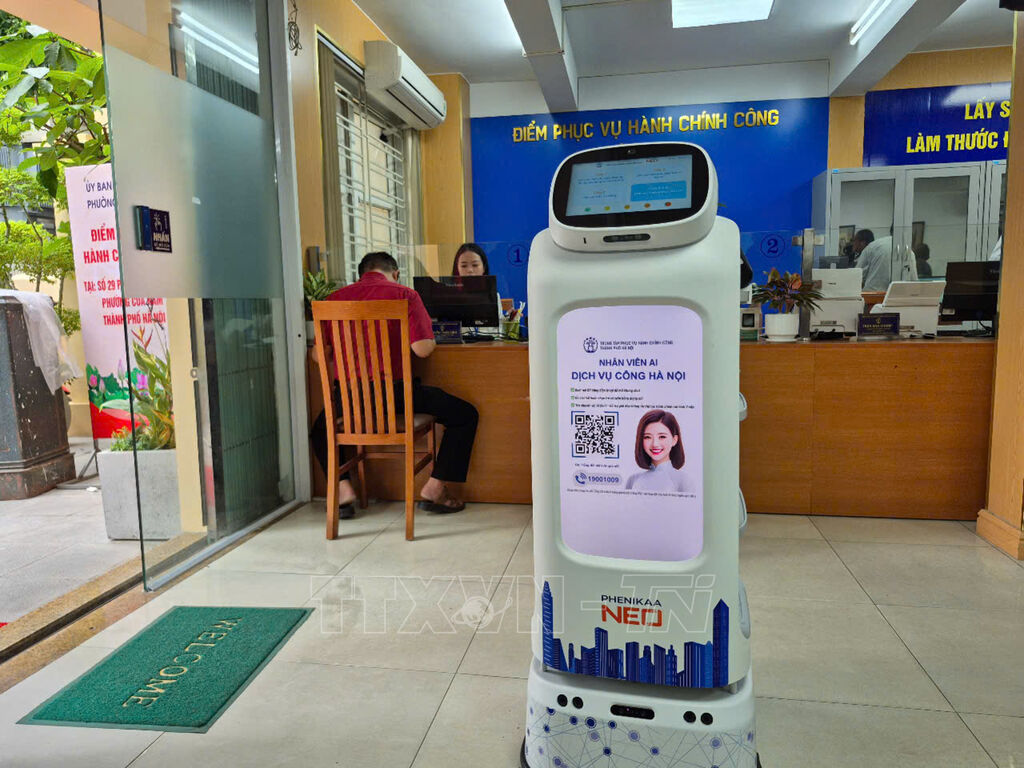 Robot AI áp dụng công nghệ trí tuệ nhân tạo hỗ trợ tự động hóa trong việc hướng dẫn, trợ giúp người dân thực hiện các thủ tục hành chính. Ảnh: Nguyễn Thắng/TTXVN