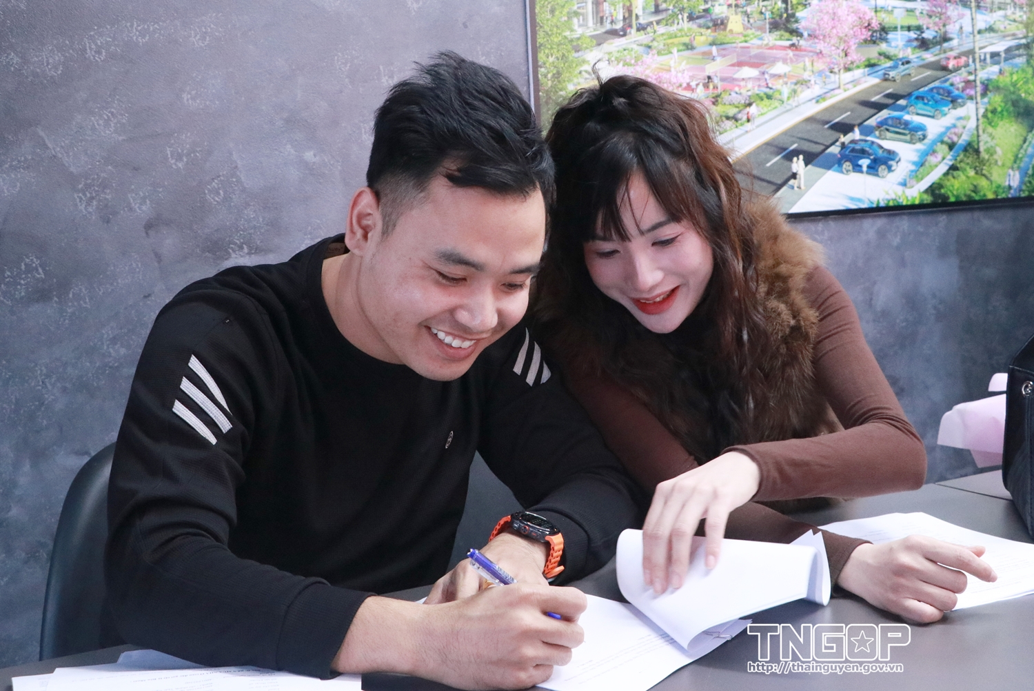Vợ chồng anh Vũ Văn Nam (Hưng Yên) vui vẻ khi hoàn thiện các thủ tục bàn giao căn hộ