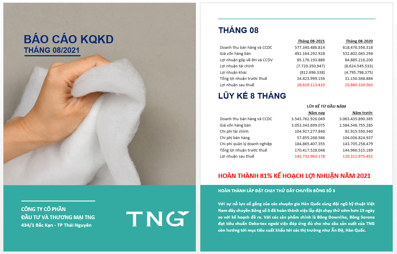 Tháng 8 năm 2021, Công ty Cổ phần đầu tư và thương mại TNG hoàn thành 81% kế hoạch lợi nhuận năm 2021.