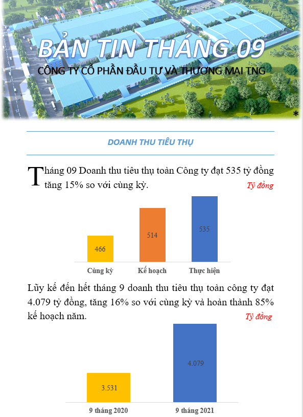 Theo số liệu thống kê của Công ty TNHH Đầu tư và Thương mại TNG, trong tháng 9, doanh thu tiêu thụ toàn Công ty đạt 535 tỷ đồng, tăng 15% so với cùng kỳ; lũy kế đến hết tháng 9 doanh thu tiêu thụ đạt 4.079 tỷ đồng, tăng 16% so với cùng kỳ và hoàn thành 85% kế hoạch năm.