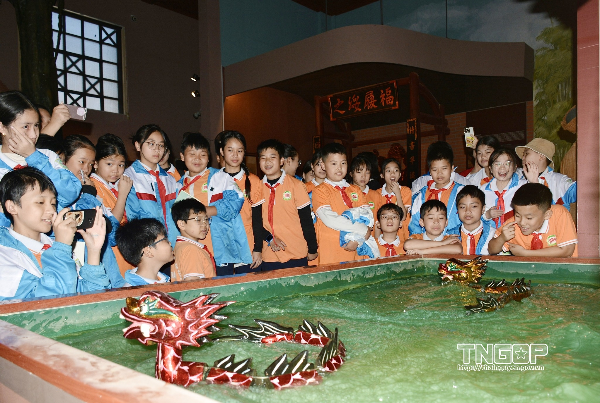 Học sinh hứng thú khi tìm hiểu loại hình sân khấu dân gian múa rối nước tại Bảo tàng Văn hóa các dân tộc Việt Nam