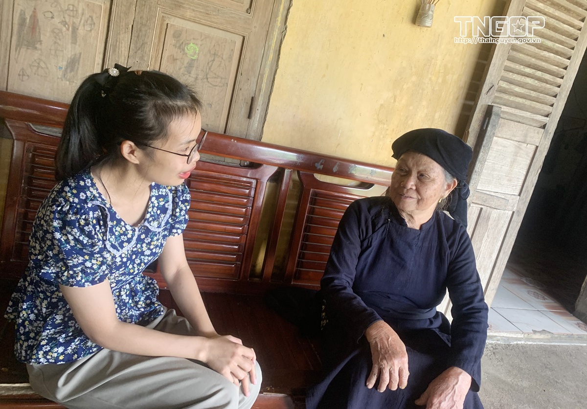 Bà Đồng Thị Sơ kể chuyện cho thế hệ trẻ bên cây đa chợ Cốc Đán - Địa điểm Bác Hồ nghỉ chân trên đường đi công tác