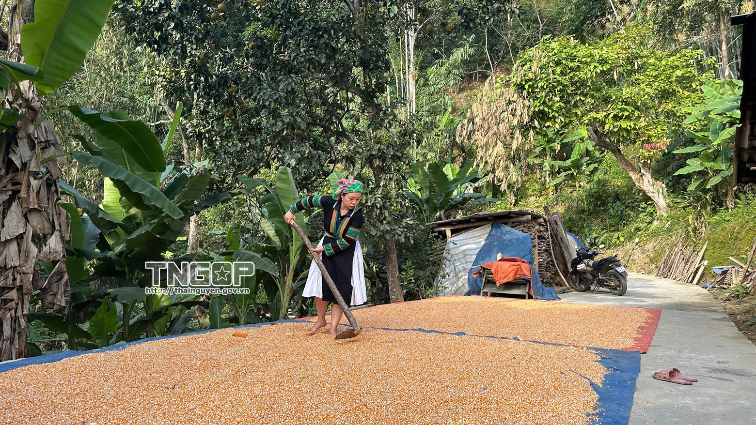 Người phụ nữ Mông ở thôn Bản Nghè, xã Cao Minh phơi ngô sau thu hoạch để chuẩn bị nguyên liệu làm mèn mén