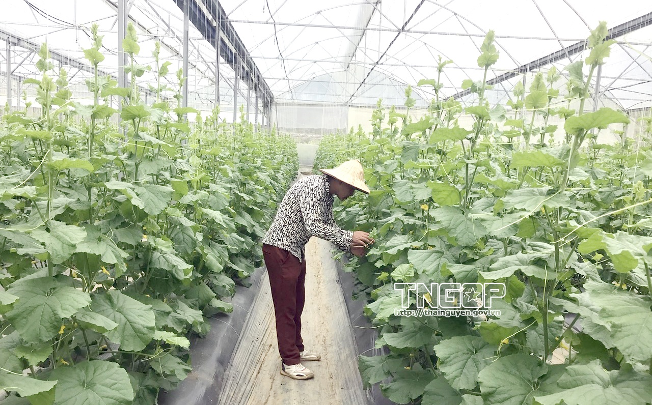 Trồng dưa trong nhà lưới tại HTX Nông nghiệp công nghệ cao Thành Đạt (xã Hiệp Lực)