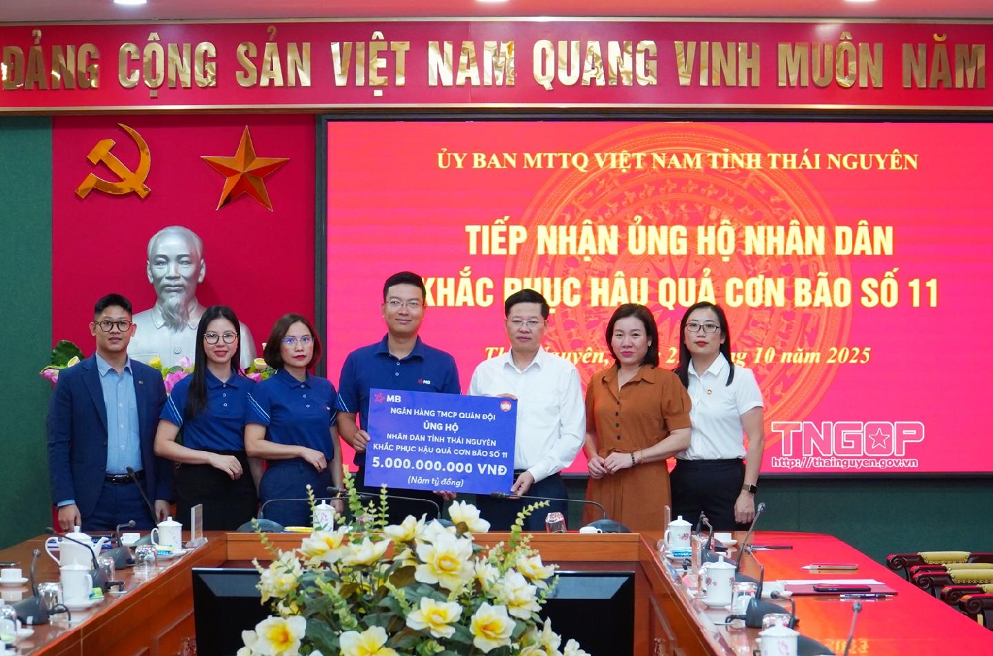 Chiều 22/10, Ngân hàng Thương mại CP Quân đội (MBBank) đã trao 5 tỷ đồng để hỗ trợ tỉnh Thái Nguyên khắc phục hậu quả bão số 11 và hoàn lưu bão. Tiếp Đoàn và đón nhận hỗ trợ có đồng chí Đinh Quang Tuyên, Phó Bí thư Tỉnh ủy, Chủ tịch Ủy ban MTTQ tỉnh.