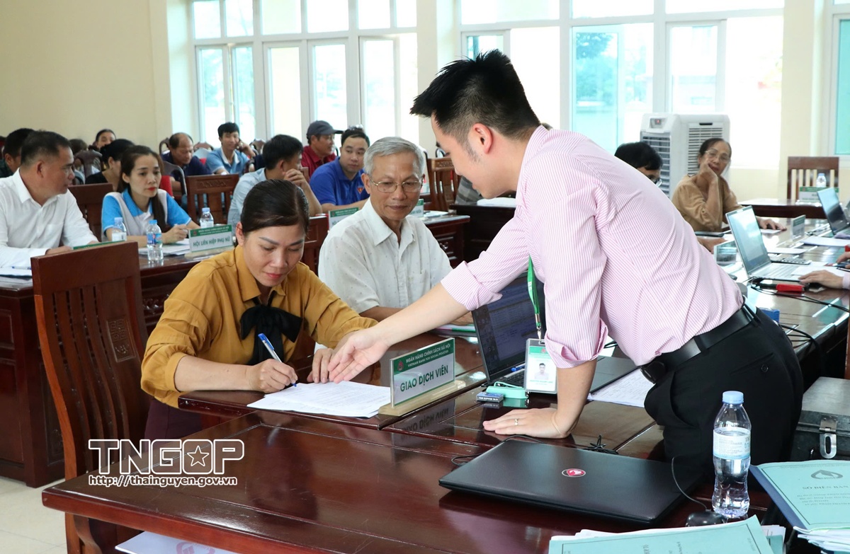 Cán bộ NHCSXH hướng dẫn người dân hoàn thiện hồ sơ vay vốn tại điểm giao dịch xã