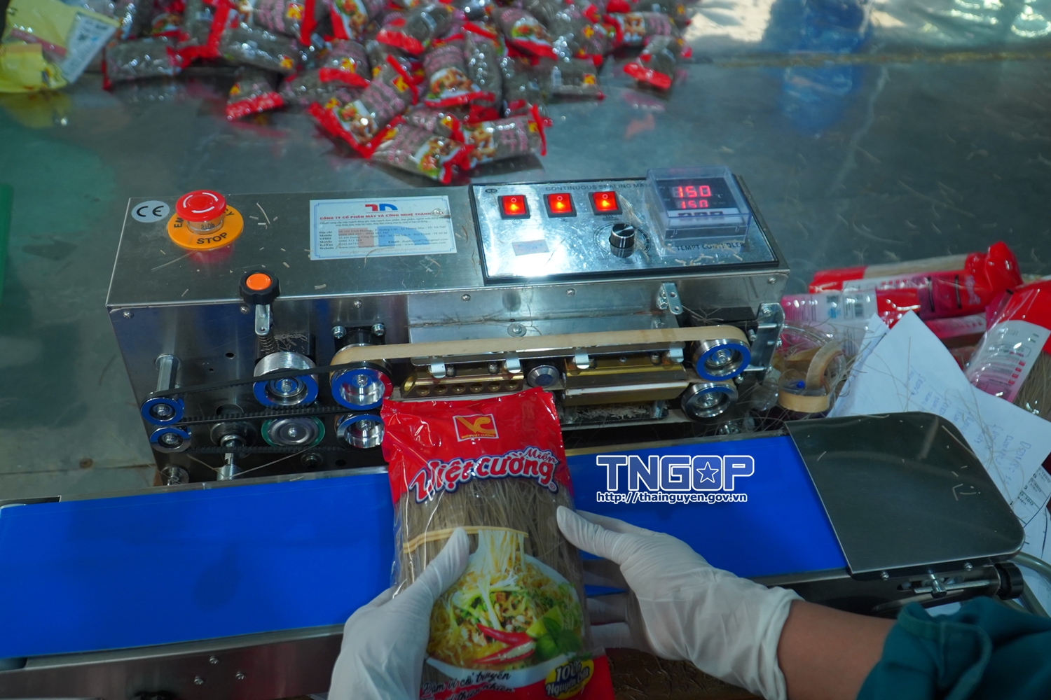 Dây chuyền đóng gói miến dong được vận hành bằng máy móc hiện đại, giúp nâng cao năng suất, bảo đảm yêu cầu về chất lượng và tiêu chuẩn thị trường