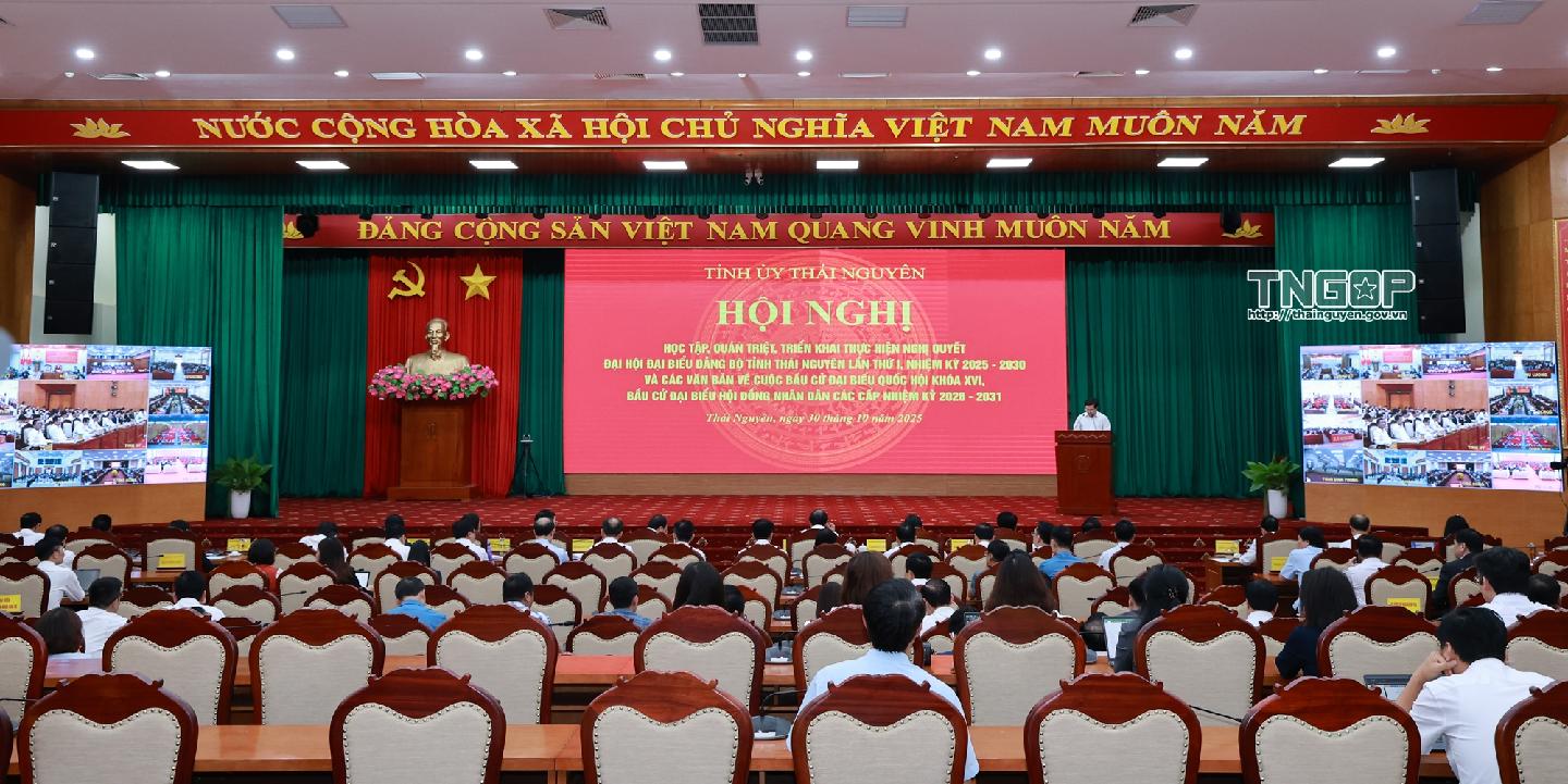 Chiều 30/10, Tỉnh ủy Thái Nguyên tổ chức Hội nghị học tập, quán triệt, triển khai thực hiện Nghị quyết Đại hội đại biểu Đảng bộ tỉnh Thái Nguyên lần thứ I, nhiệm kỳ 2025 - 2030 và các văn bản về cuộc bầu cử đại biểu Quốc hội khóa XVI, bầu cử đại biểu HĐND các cấp, nhiệm kỳ 2026 - 2031.