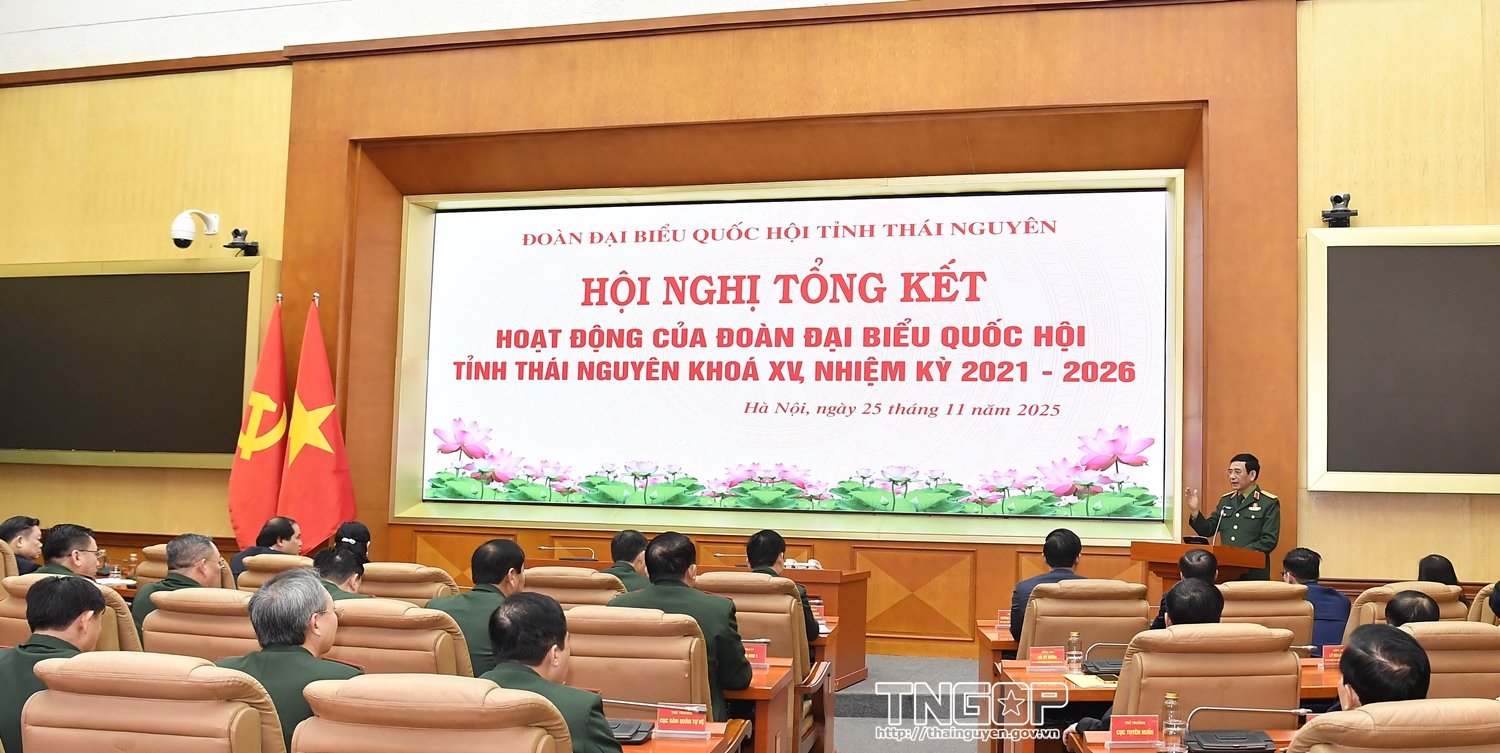 Đại tướng trân trọng cảm ơn Đoàn đại biểu Quốc hội tỉnh Thái Nguyên đã phối hợp chặt chẽ, khảo sát thực tế, góp phần hoàn thiện các chính sách vượt trội cho ngành công nghiệp quốc phòng, đặc biệt là chính sách thu hút nhân tài. Đại tướng cũng ghi nhận đóng góp quan trọng của Đoàn đại biểu Quốc hội tỉnh Thái Nguyên vào thành tựu chung của Quốc hội khóa XV trong lập pháp, giám sát tối cao, ngoại giao nghị viện và các hoạt động vì dân, như hỗ trợ trong đại dịch COVID-19, giúp thân nhân liệt sĩ, thúc đẩy dự án hạ tầng phục vụ phát triển kinh tế - xã hội, nhất là ở vùng đồng bào dân tộc thiểu số và miền núi.