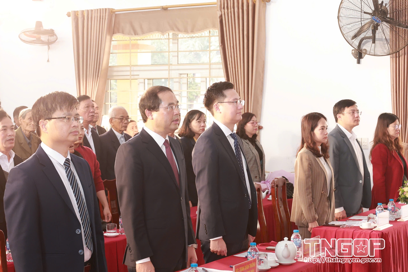 Các đại biểu dự Lễ trao huy hiệu Đảng đợt 03/02/2026 thực hiện nghi thức chào cờ