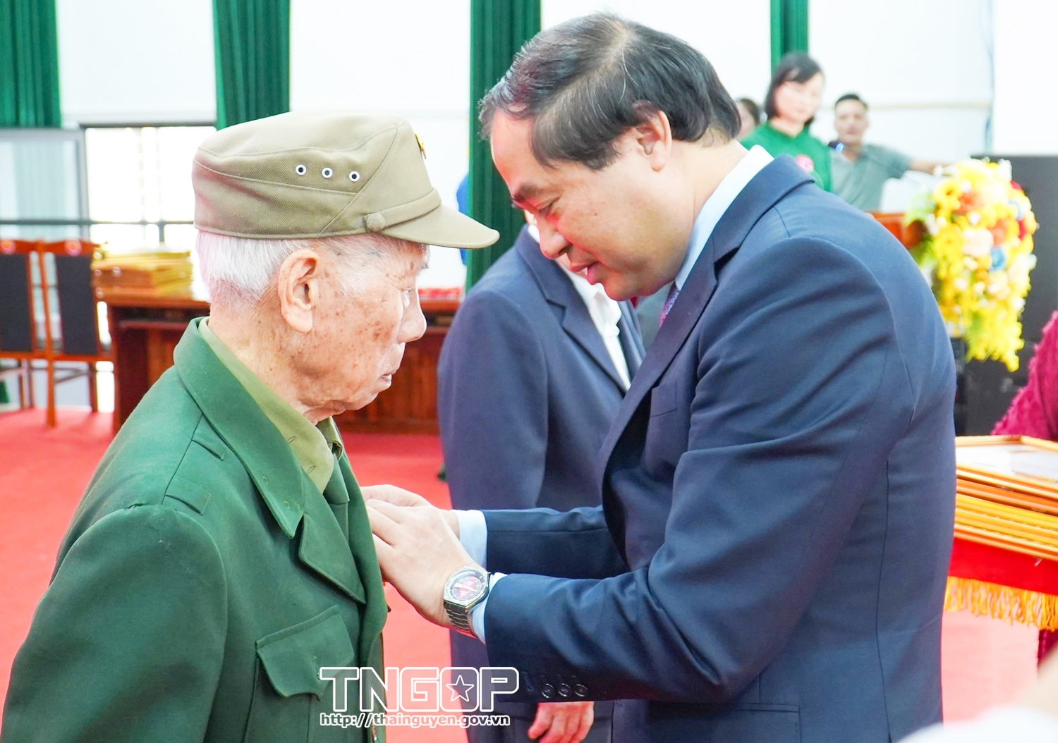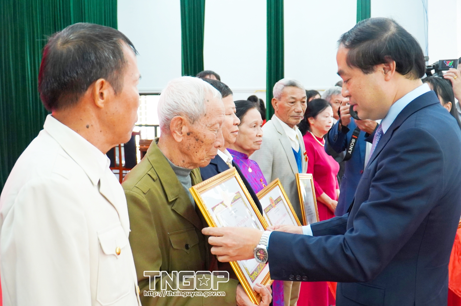 Đồng chí Trịnh Xuân Trường, Bí thư Tỉnh ủy Thái Nguyên trao Huy hiệu Đảng cho các đảng viên 70 năm, 65 năm, 60 năm tuổi Đảng