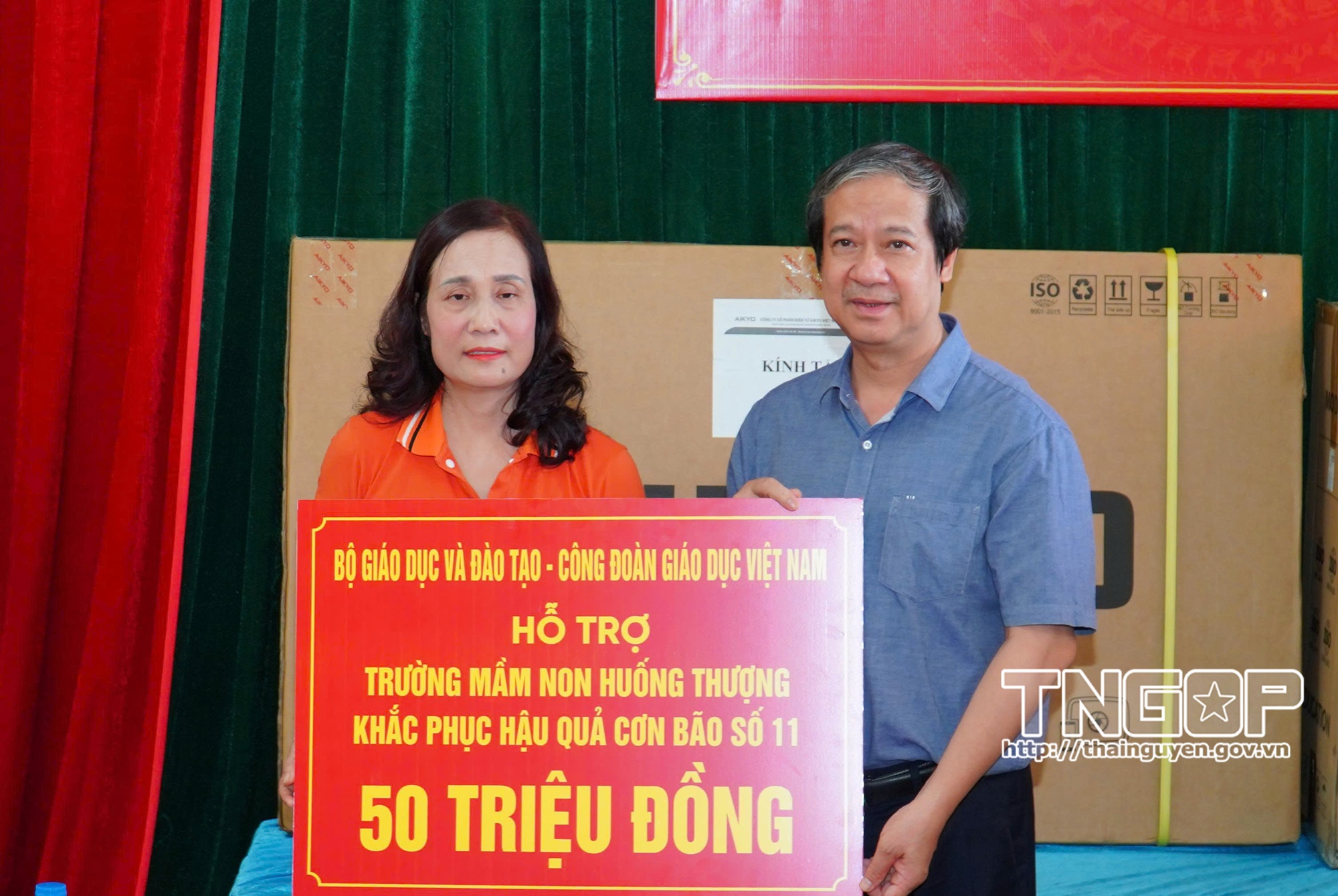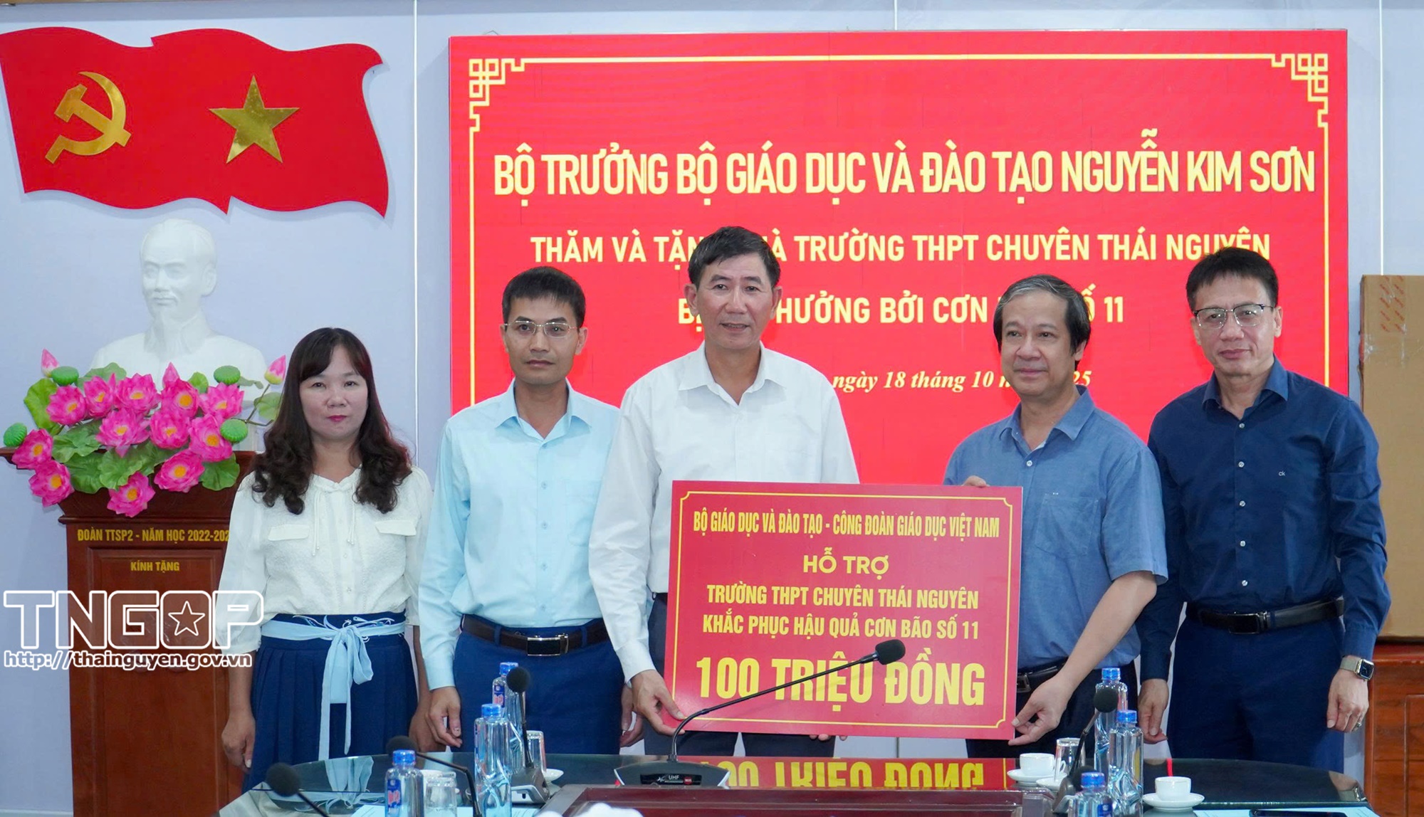 Bộ trưởng trao vật phẩm và kinh phí hỗ trợ Trường THPT Chuyên Thái Nguyên khắc phục hậu quả mưa lũ