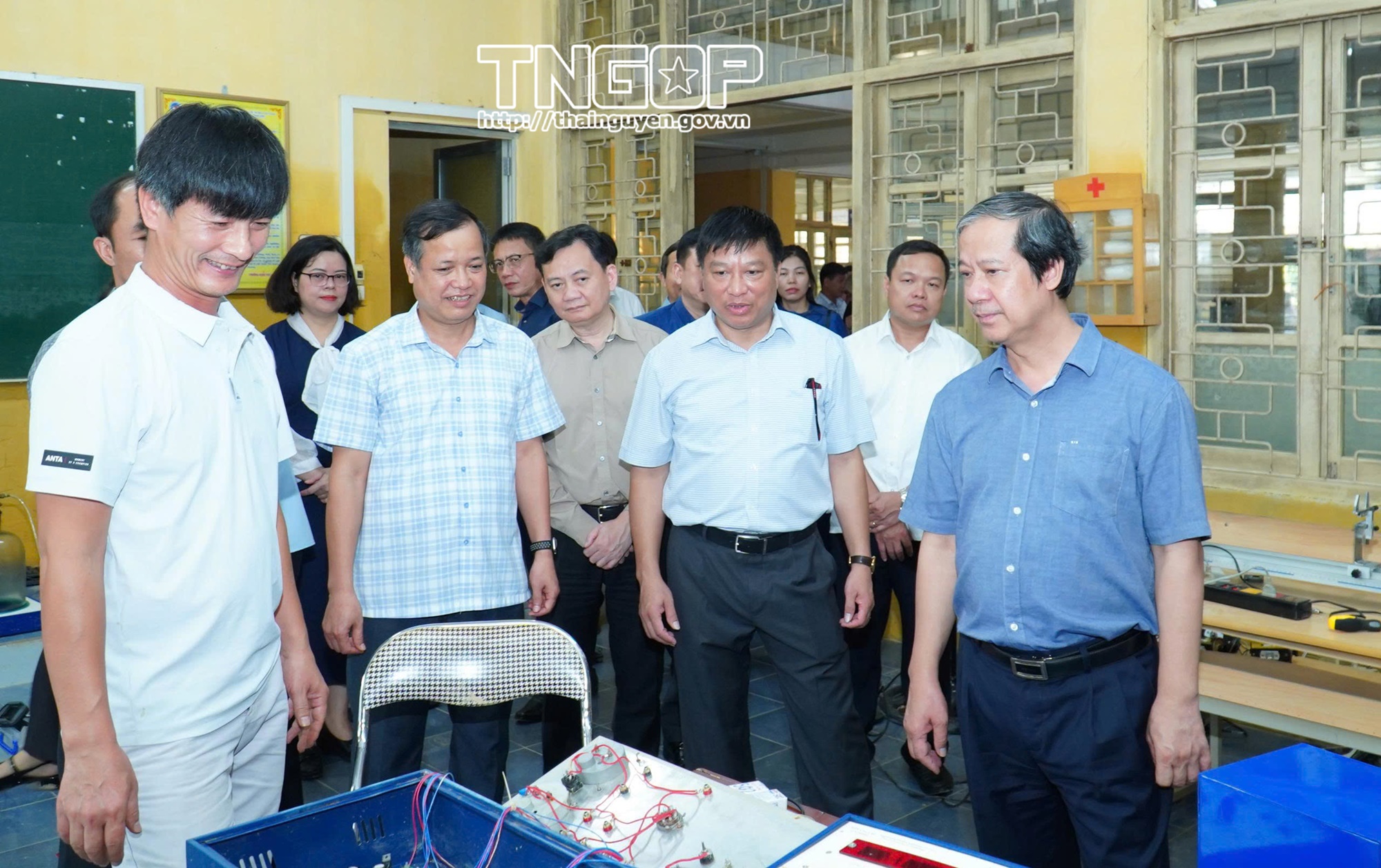 Bộ trưởng Nguyễn Kim Sơn chia sẻ và động viên những thiệt hại mưa lũ gây ra tại Trường THPT Chuyên Thái Nguyên