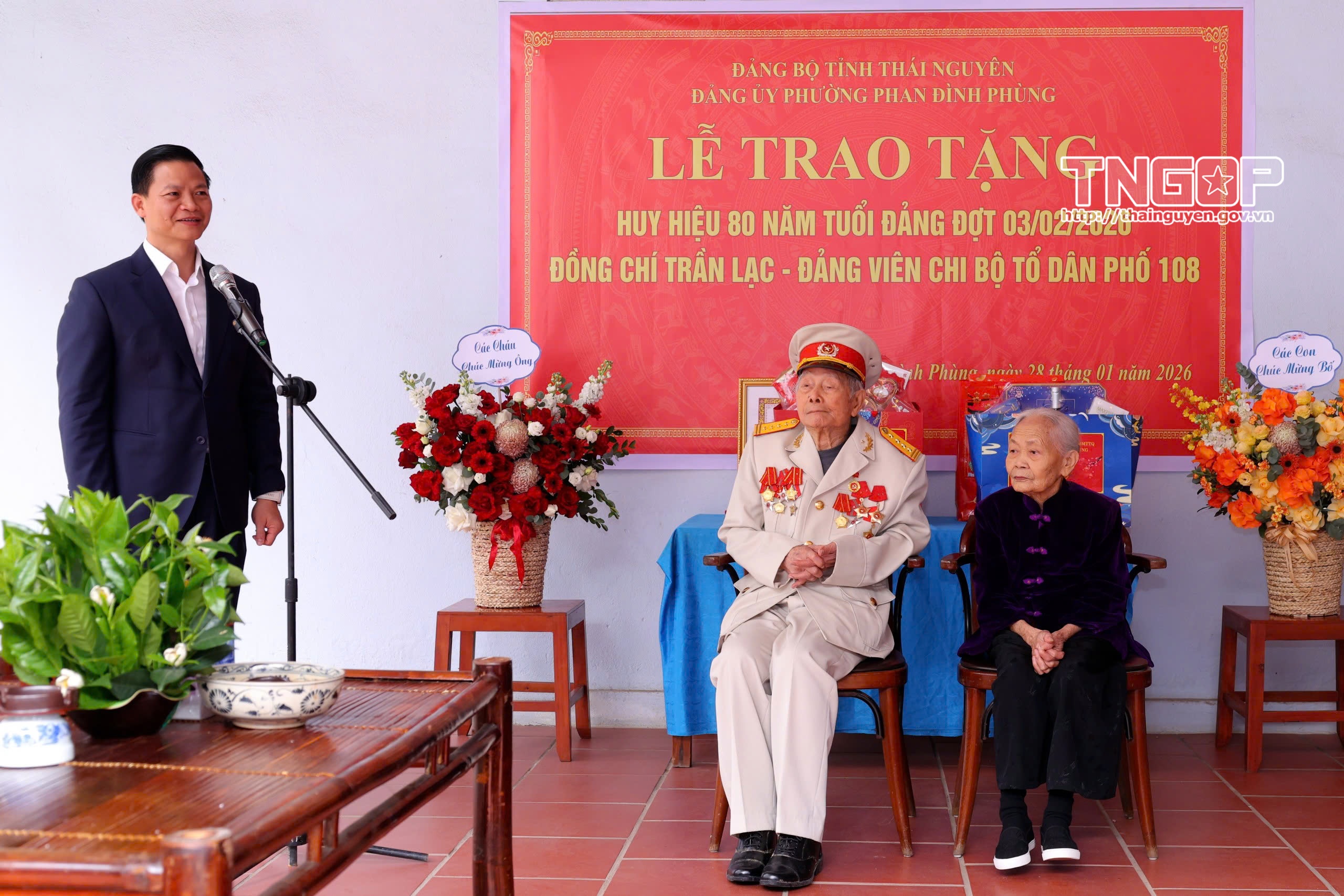 Phát biểu tại buổi Lễ, đồng chí Chủ tịch UBND tỉnh Vương Quốc Tuấn trân trọng chúc mừng, ghi nhận và biểu dương những đóng góp, cống hiến bền bỉ của đồng chí Trần Lạc đối với sự nghiệp cách mạng của Đảng. Đồng chí khẳng định, Huy hiệu 80 năm tuổi Đảng không chỉ là niềm vinh dự, tự hào của cá nhân đảng viên Trần Lạc và gia đình, mà còn là niềm tự hào của Chi bộ tổ 108 và Đảng bộ phường Phan Đình Phùng. Đồng chí đề nghị phường Phan Đình Phùng tiếp tục đẩy mạnh tuyên truyền, lan tỏa những tấm gương đảng viên tiêu biểu như đồng chí Trần Lạc, qua đó góp phần giáo dục truyền thống cách mạng cho thế hệ trẻ, xây dựng địa phương ngày càng phát triển.