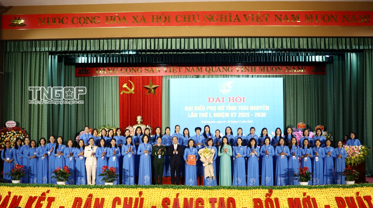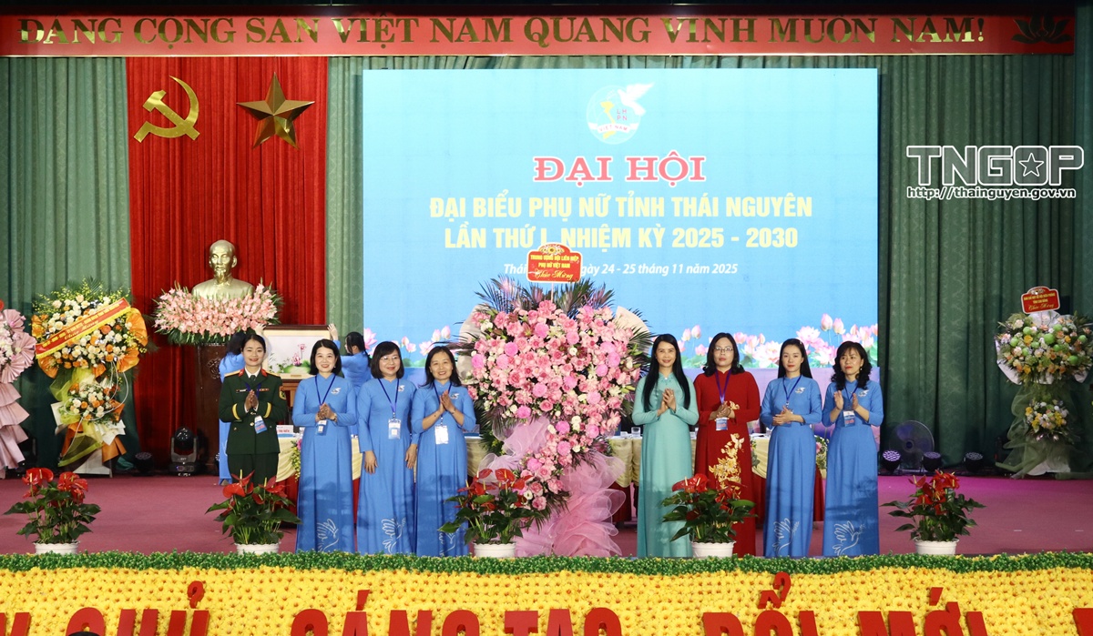 Lãnh đạo Hội LHPN Việt Nam và lãnh đạo tỉnh Thái Nguyên tặng hoa chúc mừng Ban Chấp hành Hội LHPN tỉnh Thái Nguyên khóa I, nhiệm kỳ 2025 - 2030