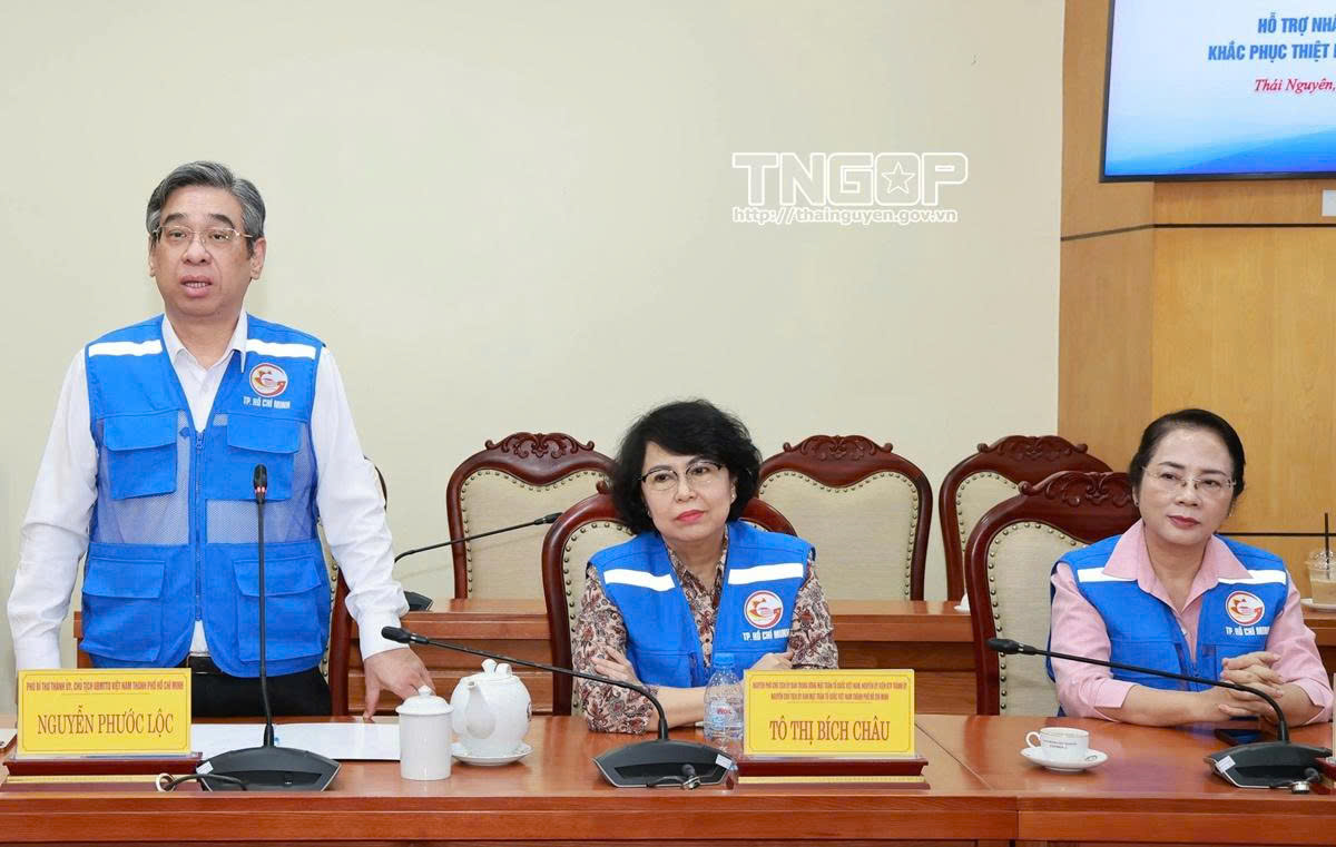 Phát biểu tại buổi tiếp nhận, đồng chí Nguyễn Phước Lộc, Phó Bí thư Thành ủy, Chủ tịch Ủy ban MTTQ Thành phố Hồ Chí Minh bày tỏ xúc động khi được đến thăm Thái Nguyên - vùng đất giàu truyền thống cách mạng. Đồng chí trân trọng chuyển lời thăm hỏi và chia sẻ sâu sắc của đồng chí Trần Lưu Quang, Bí thư Thành ủy Thành phố Hồ Chí Minh cùng tập thể lãnh đạo Thành phố tới Đảng bộ, chính quyền và Nhân dân các dân tộc tỉnh Thái Nguyên trước những thiệt hại nặng nề do bão lũ gây ra. Đồng chí Chủ tịch Ủy ban MTTQ Thành phố Hồ Chí Minh đánh giá cao tinh thần đoàn kết, nỗ lực vượt khó của Đảng bộ, chính quyền và Nhân dân tỉnh Thái Nguyên trong việc khôi phục sản xuất, ổn định đời sống và phát triển kinh tế - xã hội sau thiên tai. Đồng thời nhấn mạnh, trong hai năm qua, đặc biệt sau bão Yagi năm 2024, Ủy ban MTTQ Thành phố Hồ Chí Minh và Ủy ban MTTQ tỉnh Thái Nguyên đã phối hợp chặt chẽ trong công tác hỗ trợ khắc phục hậu quả thiên tai. Các nguồn lực hỗ trợ được tỉnh Thái Nguyên tiếp nhận và sử dụng hiệu quả, kịp thời. Trong đợt này, Thành phố Hồ Chí Minh tiếp tục trao hỗ trợ 20 tỷ đồng, với mong muốn góp phần cùng Đảng bộ, chính quyền và Nhân dân tỉnh Thái Nguyên sớm vượt qua khó khăn, ổn định cuộc sống. Đồng chí cũng bày tỏ tin tưởng cấp ủy, chính quyền tỉnh Thái Nguyên sẽ tiếp tục lãnh đạo, chỉ đạo hiệu quả các nhiệm vụ phát triển kinh tế - xã hội, để đời sống Nhân dân ngày càng ấm no, hạnh phúc.