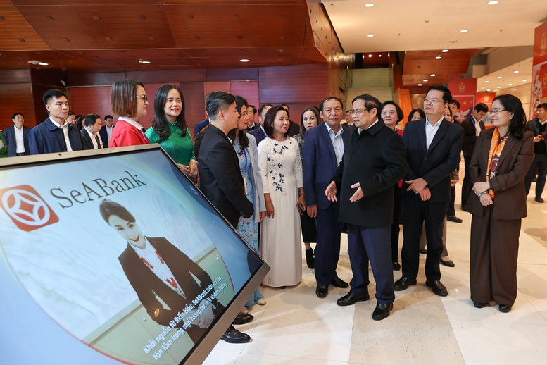 Thủ tướng Phạm Minh Chính kiểm tra khu trưng bày ảnh về phong trào thi đua yêu nước - Ảnh: VGP/Nhật Bắc