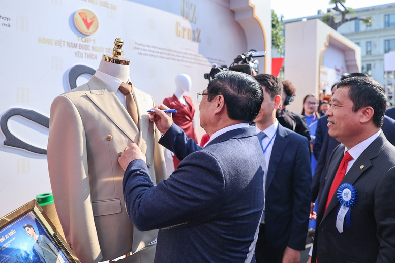 Thủ tướng ký lưu bút lên sản phẩm sản xuất thứ 25 triệu của Tổng công ty May 10 - Ảnh: VGP/Nhật Bắc