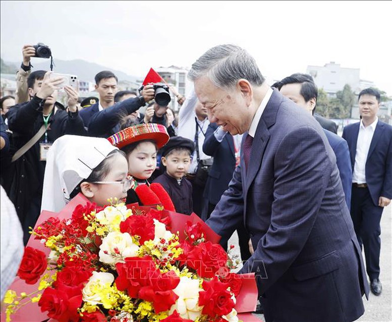 Gặp gỡ đồng bào và các học sinh tại Sân vận động tỉnh Cao Bằng, Tổng Bí thư Tô Lâm bày tỏ xúc động sâu sắc, được đứng tại nơi này để gặp gỡ đồng bào, các Mẹ Việt Nam Anh hùng, các đồng chí lão thành cách mạng, người có công, người có uy tín, cán bộ, chiến sĩ, các thầy cô giáo và các học sinh; cảm nhận rõ mạch nguồn lịch sử vẫn đang chảy liên tục, sống động trong từng bản làng, từng mái trường, từng con người nơi đây.