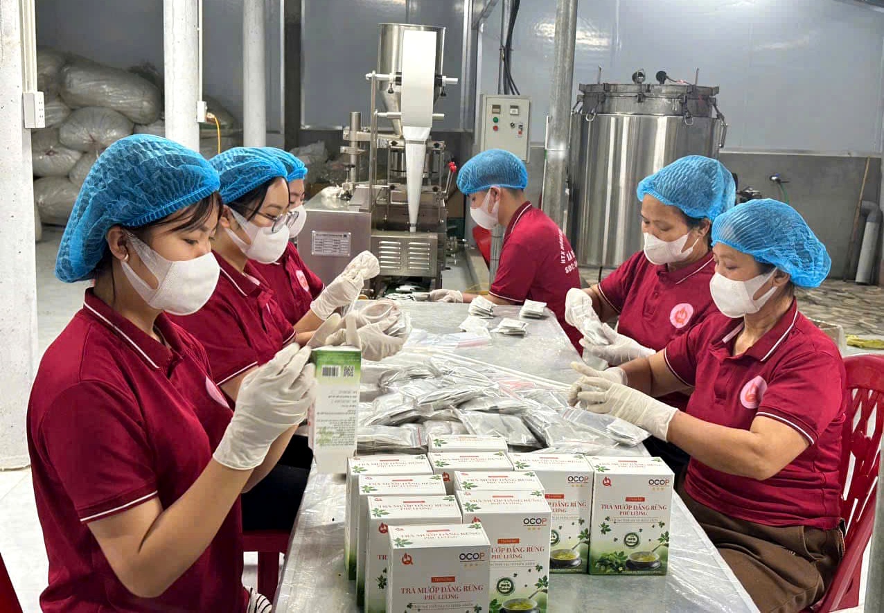 Đóng gói sản phẩm trà mướp đắng rừng tại HTX Nông nghiệp Tiên Phong (xã Yên Trạch)