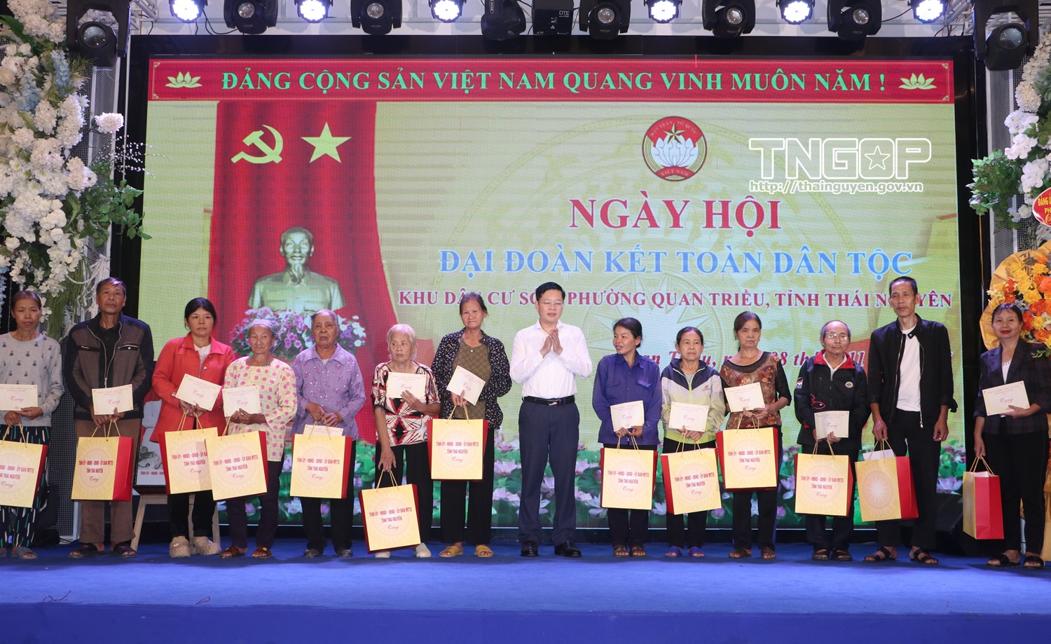 Đồng chí Đinh Quang Tuyên, Phó Bí thư Tỉnh ủy, Chủ tịch Ủy ban MTTQ tỉnh Thái Nguyên tặng quà các hộ nghèo trên địa bàn phường Quan Triều