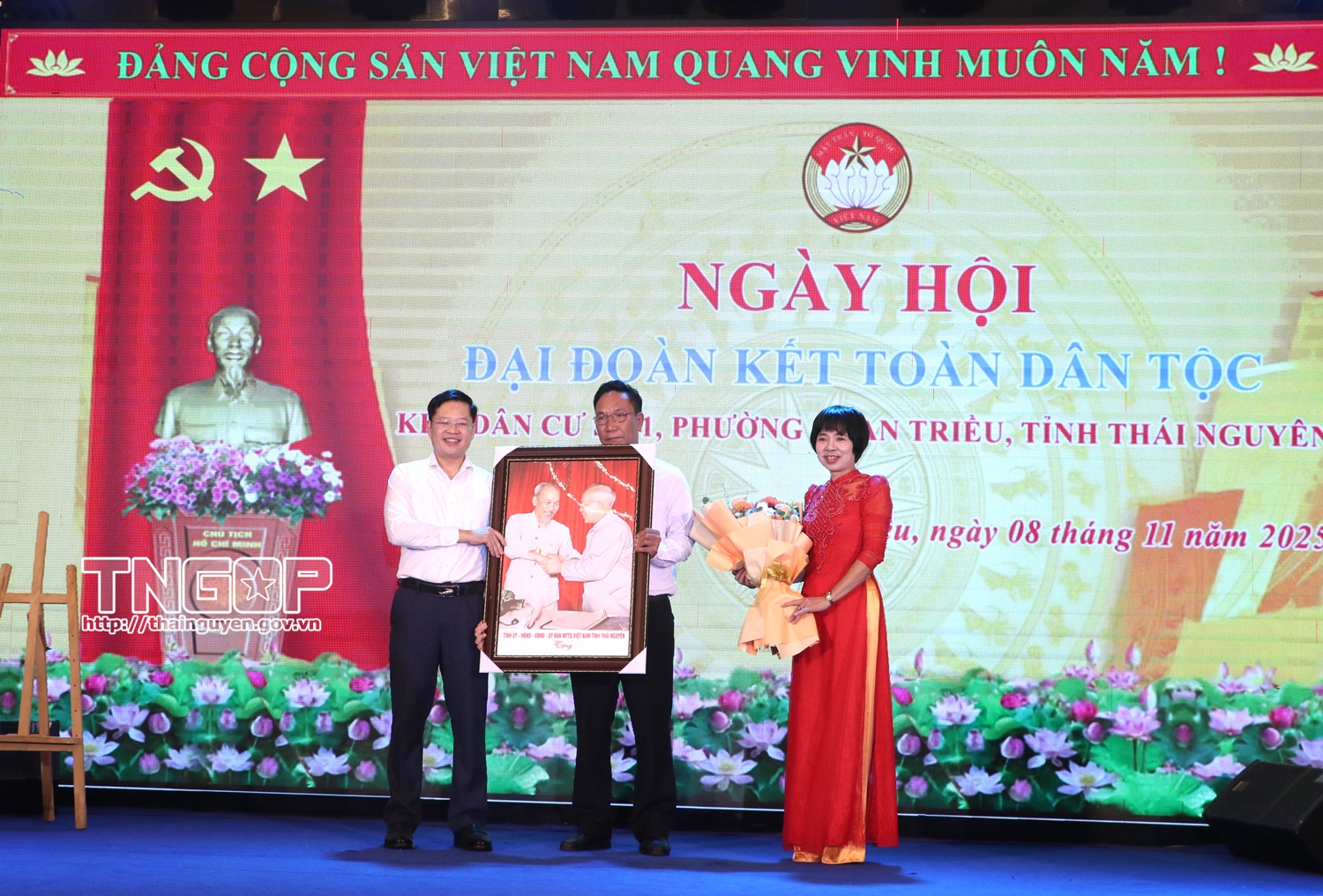 Thay mặt Tỉnh ủy, HĐND, UBND, Ủy ban MTTQ tỉnh Thái Nguyên, đồng chí Đinh Quang Tuyên tặng bức ảnh chân dung Chủ tịch Hồ Chí Minh và Đại tướng Võ Nguyên Giáp cho TDP 1
