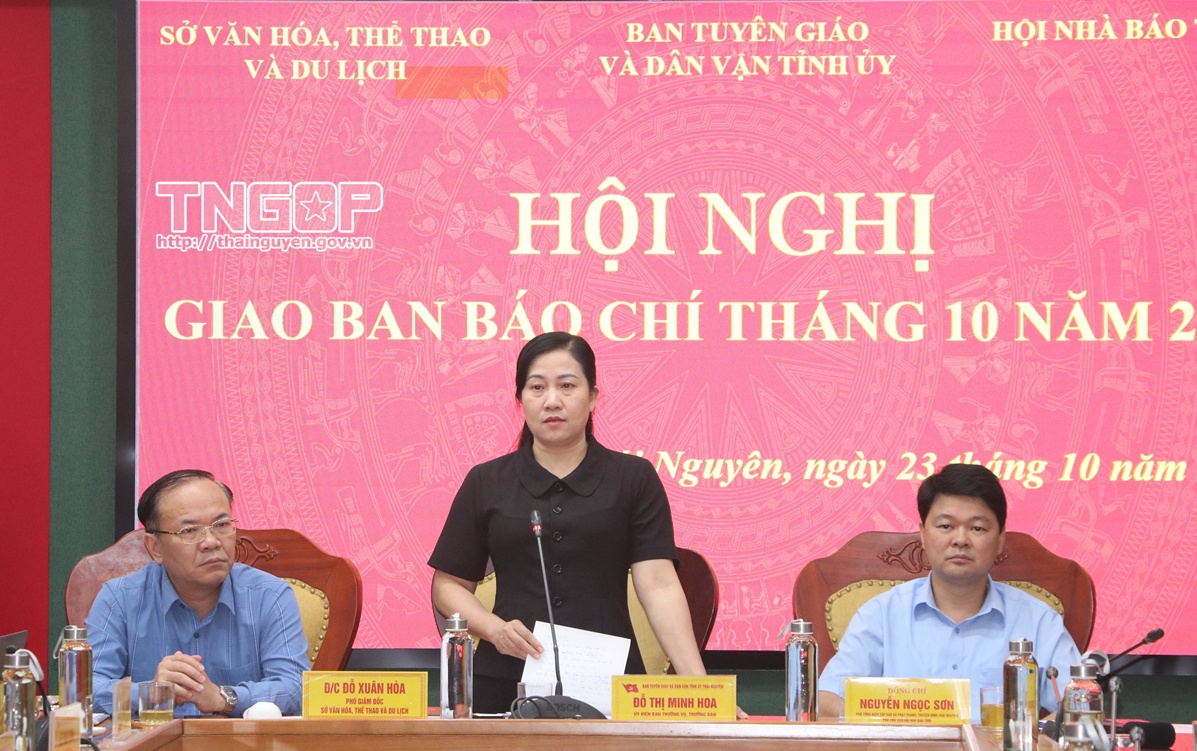 Phát biểu chỉ đạo, đồng chí Đỗ Thị Minh Hoa, Ủy viên Ban Thường vụ, Trưởng Ban Tuyên giáo và Dân vận Tỉnh ủy đề nghị trong những tháng cuối năm, các cơ quan báo chí tiếp tục tuyên truyền sâu rộng kết quả Đại hội đại biểu Đảng bộ tỉnh Thái Nguyên lần thứ I, nhiệm kỳ 2025 - 2030; kết quả Hội nghị lần thứ XIII Ban Chấp hành Trung ương Đảng khóa XIII; công tác chuẩn bị Đại hội đại biểu toàn quốc lần thứ XIV của Đảng, cuộc bầu cử đại biểu Quốc hội khóa XVI và đại biểu HĐND các cấp nhiệm kỳ 2026 - 2031; Kỳ họp thứ 10, Quốc hội khóa XV... Bên cạnh đó, đẩy mạnh tuyên truyền về tình hình phát triển kinh tế - xã hội 10 tháng năm 2025 và các nhiệm vụ, giải pháp trọng tâm của tỉnh, những nỗ lực khắc phục hậu quả bão lũ, phục hồi sản xuất, ổn định đời sống Nhân dân; công tác phòng, chống tham nhũng, tiêu cực, thực hành tiết kiệm, chống lãng phí; tuyên truyền về kết quả Đại hội đại biểu MTTQ Việt Nam và các tổ chức chính trị - xã hội các cấp tỉnh Thái Nguyên; Đại hội đại biểu MTTQ Việt Nam tỉnh Thái Nguyên, nhiệm kỳ 2025 - 2030; biểu dương các điển hình tiên tiến, gương người tốt, việc tốt; hoạt động của các cấp, các ngành hướng về cơ sở, nhất là trong những tháng cuối năm...