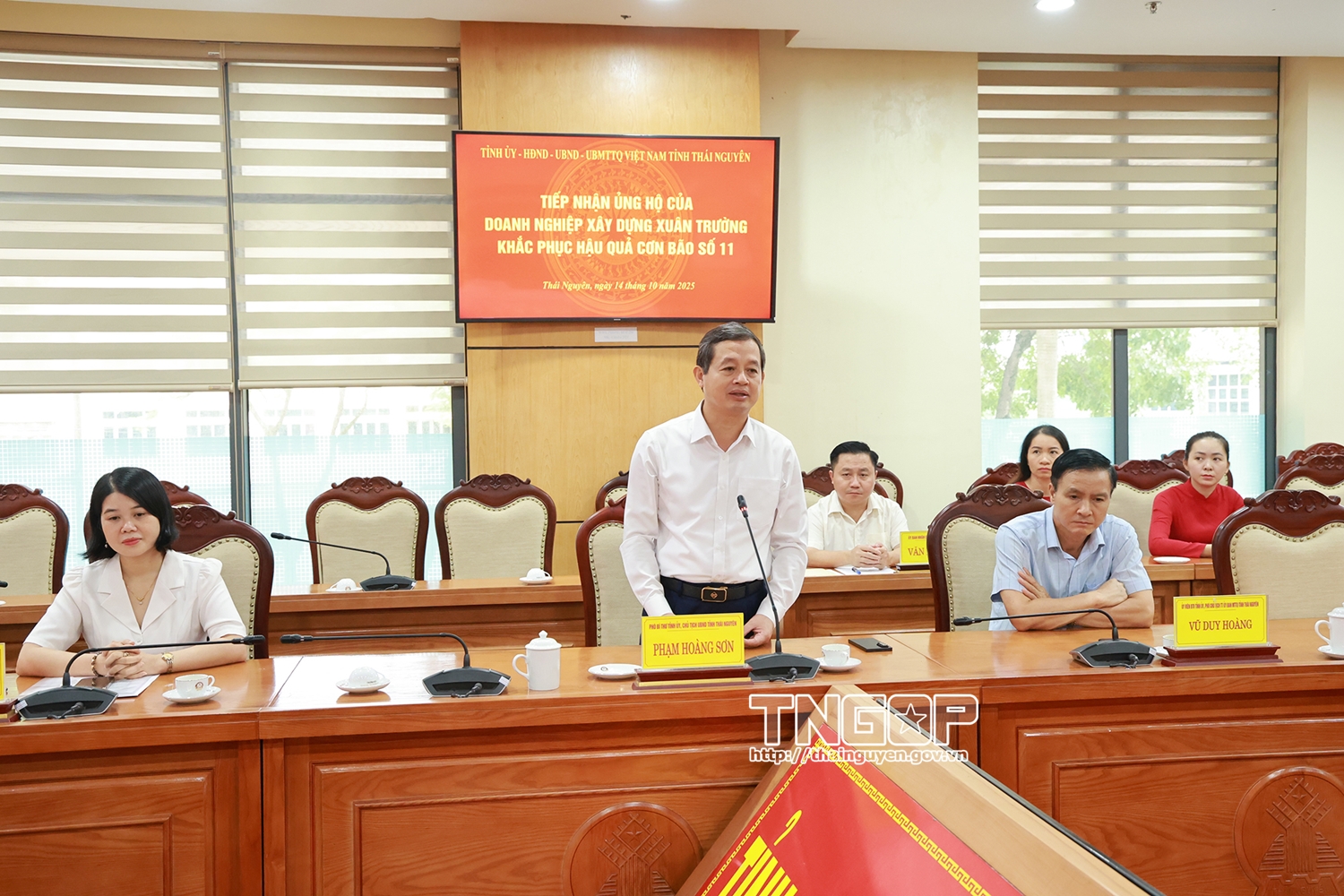 Thay mặt lãnh đạo tỉnh, đồng chí Phạm Hoàng Sơn, Phó Bí thư Tỉnh ủy, Chủ tịch UBND tỉnh ghi nhận và cảm ơn nghĩa cử của Doanh nghiệp Xây dựng Xuân Trường - một doanh nghiệp luôn đồng hành cùng các hoạt động an sinh xã hội của tỉnh Thái Nguyên và trên cả nước. Đồng chí khẳng định sự ủng hộ kịp thời, thiết thực này là nguồn động viên to lớn, góp phần tiếp thêm sức mạnh để tỉnh Thái Nguyên và Nhân dân vượt qua khó khăn, khôi phục sản xuất và ổn định đời sống sau bão lũ.
