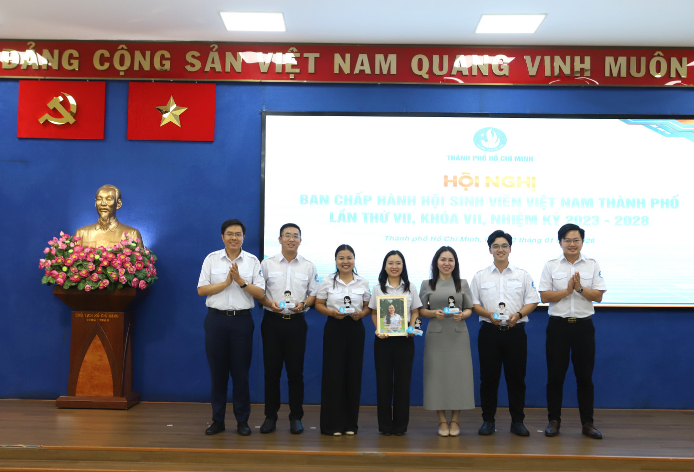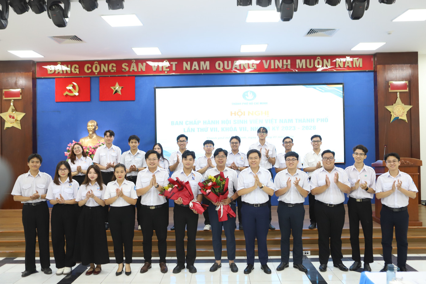 Hai tân Phó Chủ tịch và các Ủy viên Ban Chấp hành, Ban Thư ký Hội SVVN TPHCM khóa VII ra mắt.