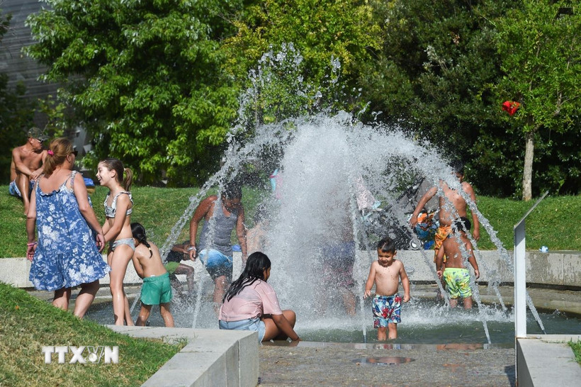 Người dân tránh nóng bên đài phun nước tại Madrid, Tây Ban Nha. (Ảnh: THX/TTXVN)