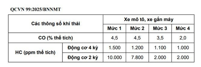Giá trị giới hạn tối đa cho phép của các thông số CO, HC trong khí thải xe mô tô, xe gắn máy lắp động cơ cháy cưỡng bức tham gia giao thông đường bộ. (Nguồn: Bộ NNMT)