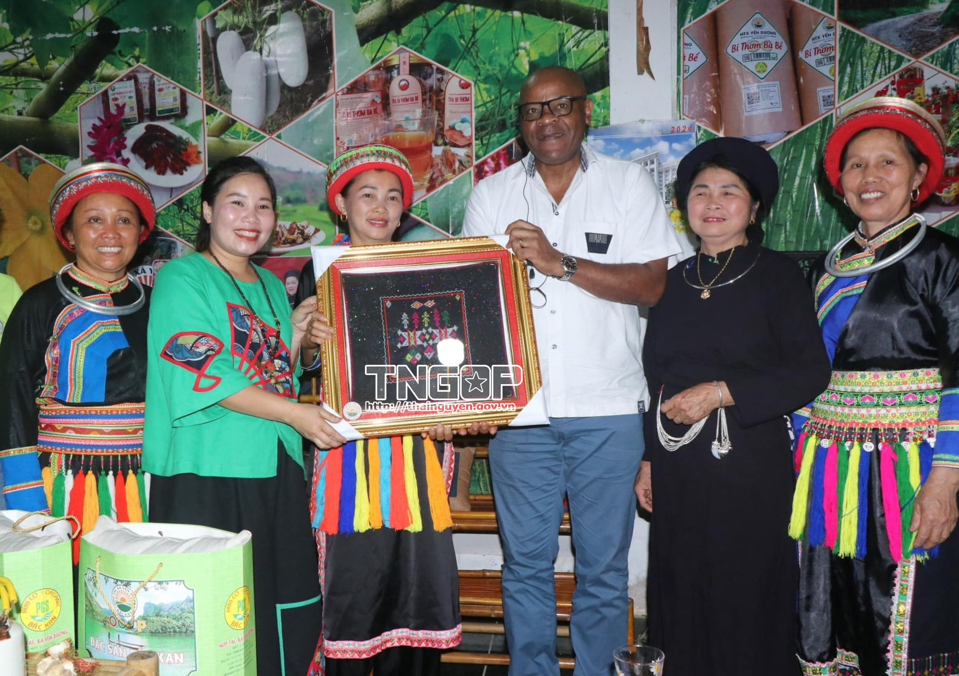 Chị Ma Thị Ninh, Giám đốc HTX Yến Dương (mặc áo xanh) tặng quà cho du khách khi đến tham quan, tìm hiểu về các sản phẩm bản địa của HTX