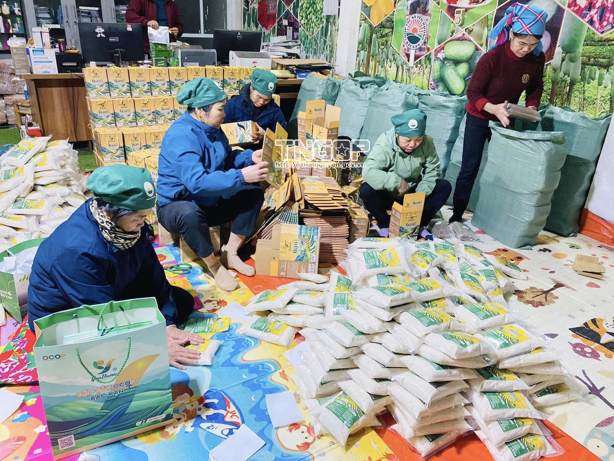 Các thành viên HTX Yến Dương đóng gói sản phẩm gạo nếp Tài
