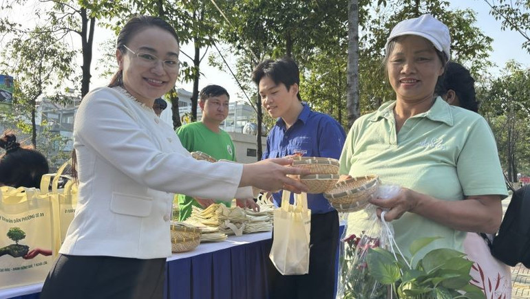 Người dân vui vẻ nhận quà là vật dụng bằng tre thân thiện với môi trường.