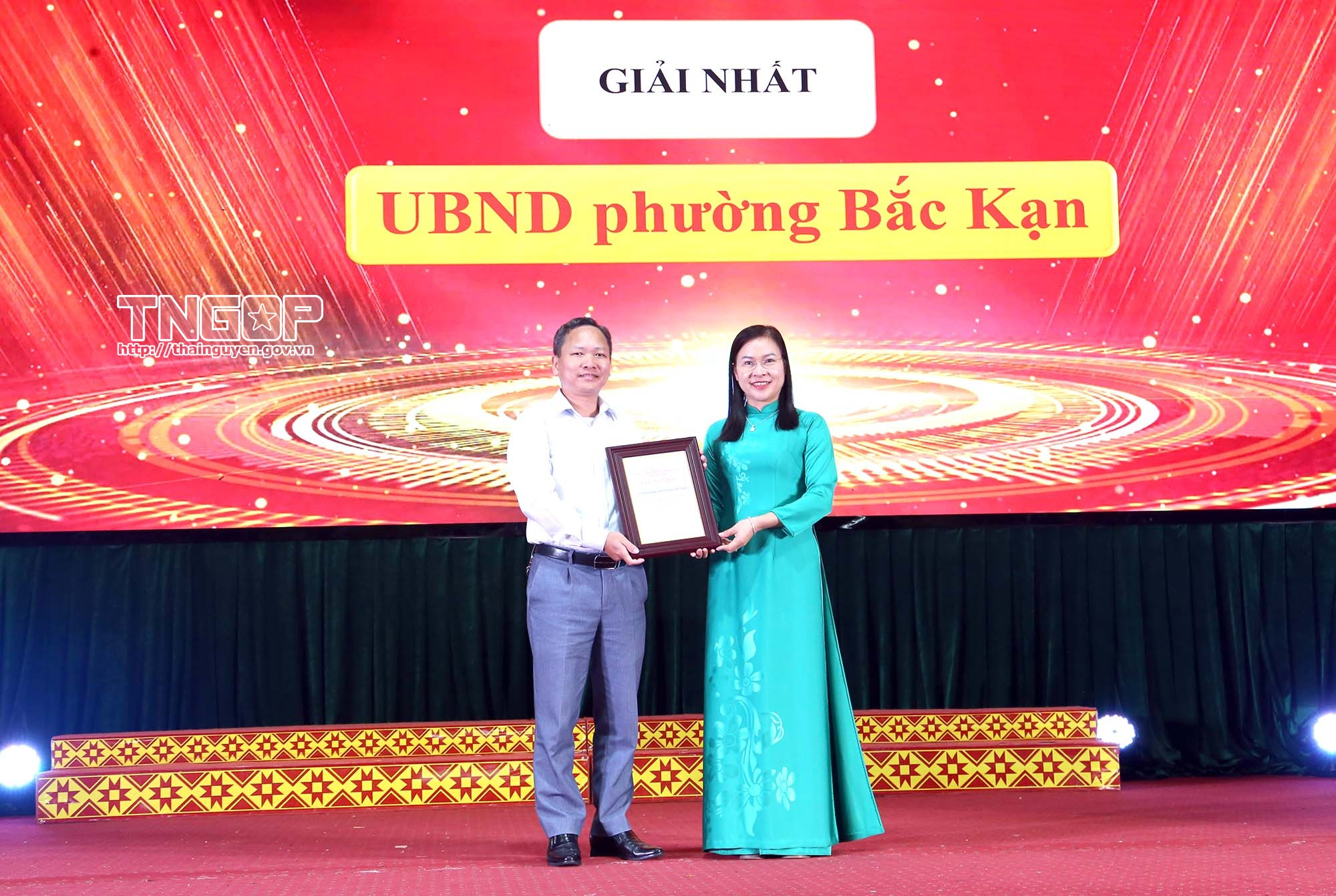 Bà Hoàng Thu Chung, Phó Giám đốc Sở Tư pháp, Phó Chủ tịch Hội đồng phối hợp PBGDPL tỉnh trao giải Nhất cho tập thể tham gia Cuộc thi Tìm hiểu pháp luật và chính sách cho người dân vùng đồng bào dân tộc thiểu số và miền núi tỉnh Thái Nguyên