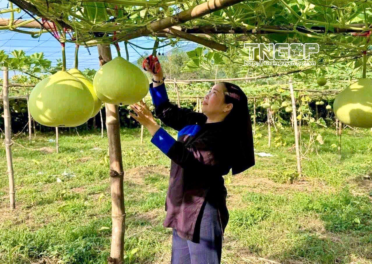 Chị Bảo An bên vườn bầu - một loại quả là nguyên liệu chế tác đàn tính