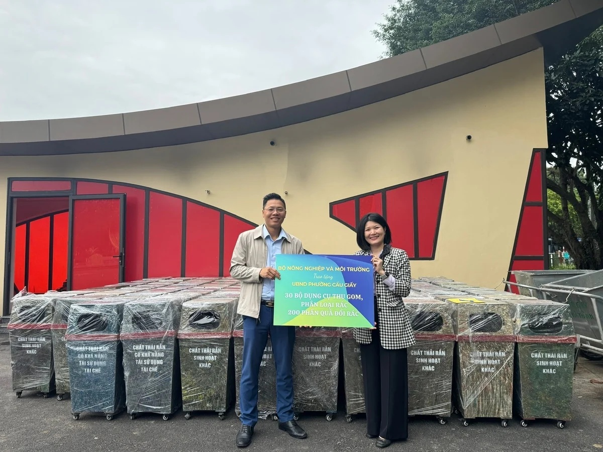 Công ty TNHH MTV Thanh Tùng 2 tặng các thùng rác hỗ trợ công tác thu gom, phân loại rác cho phường Cầu Giấy, Hà Nội. Ảnh: HT.