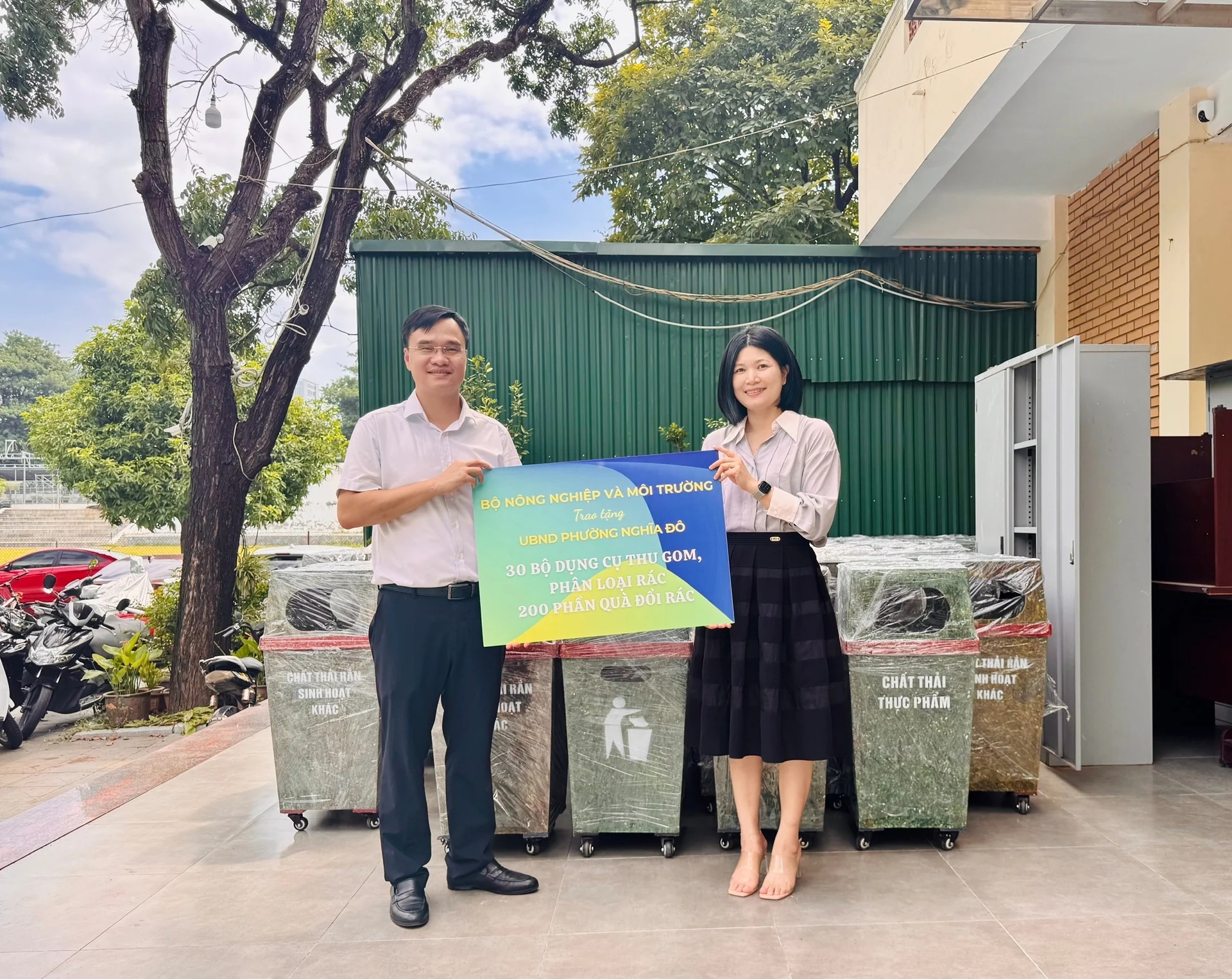 Công ty TNHH MTV Thanh Tùng 2 tặng các thùng rác hỗ trợ công tác thu gom, phân loại rác cho phường Nghĩa Đô, Hà Nội. Ảnh: HT.