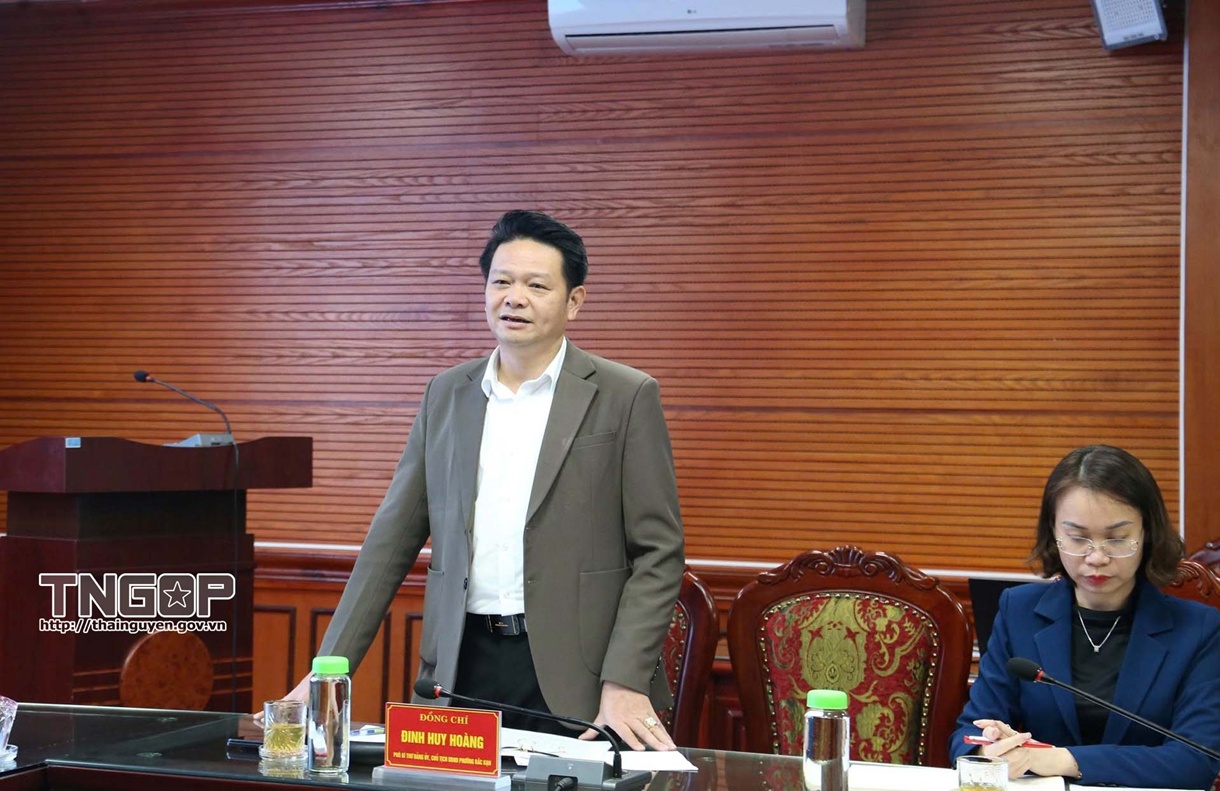 Đồng chí Đinh Huy Hoàng, Chủ tịch UBND phường Bắc Kạn báo cáo và trao đổi tại buổi kiểm tra