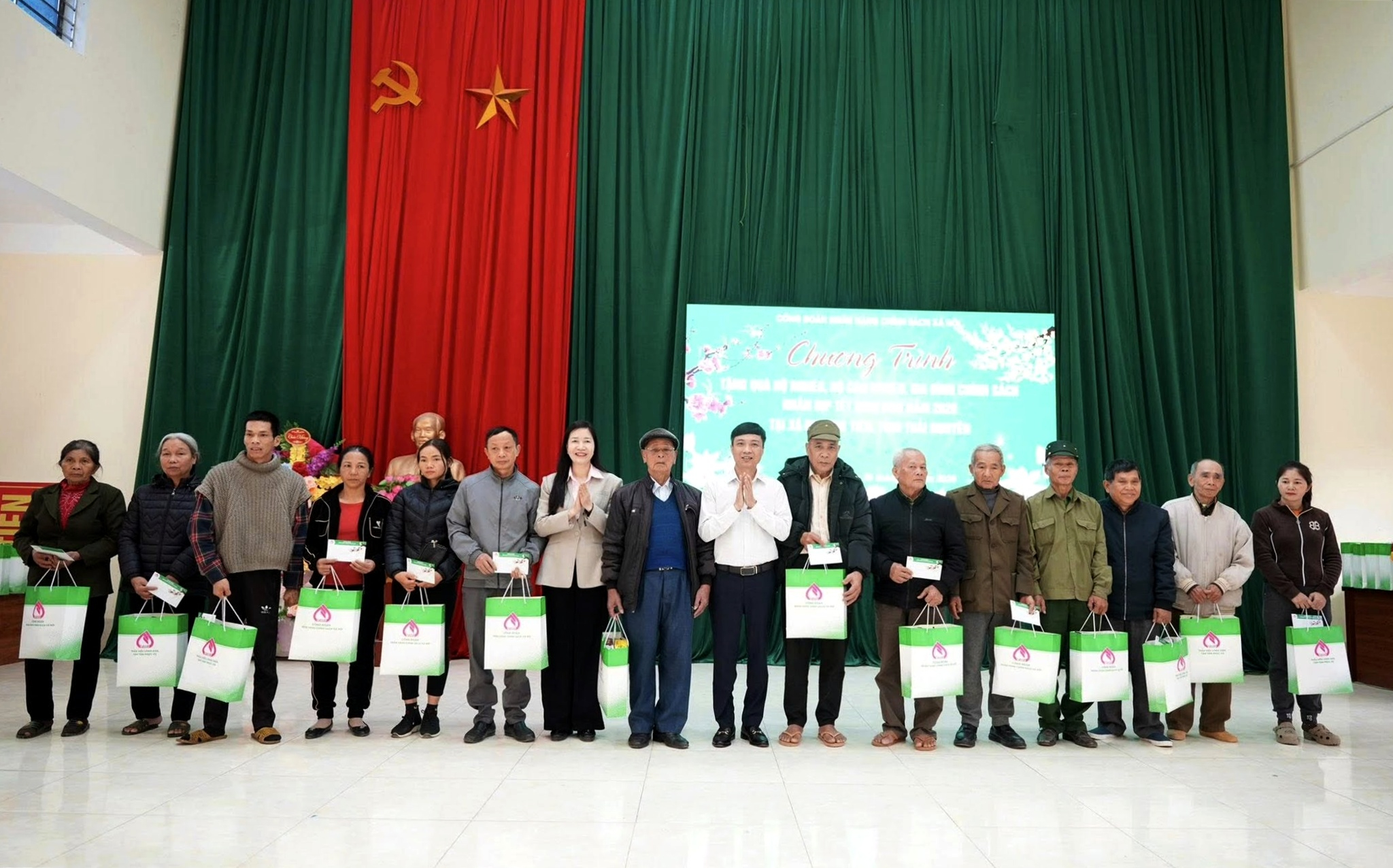 Lãnh đạo Chi nhánh NHCSXH tỉnh Thái Nguyên và lãnh đạo xã Phượng Tiến tặng quà cho hộ nghèo, cận nghèo, người có công, gia đình chính sách, đối tượng bảo trợ xã hội trên địa bàn xã Phượng Tiến