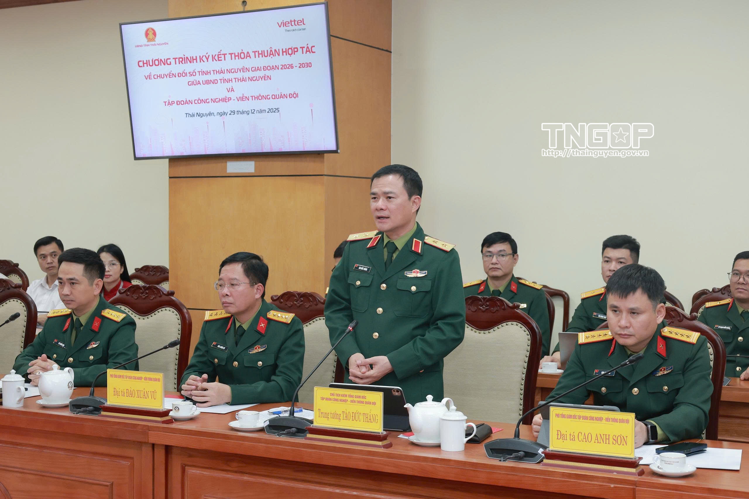 Phát biểu tại Chương trình, lãnh đạo Tập đoàn Viettel khẳng định mong muốn được đồng hành cùng tỉnh Thái Nguyên trong chuyển đổi số; xây dựng trạm BTS phủ sóng di động 4G trên toàn tỉnh, đảm bảo không còn vùng lõm sóng 4G, đồng thời nghiên cứu, triển khai mở rộng hạ tầng phủ sóng 5G, hạ tầng mạng cáp quang cố định băng rộng tại các khu vực cần thiết nhằm kiên cố hạ tầng mạng lưới, phòng, chống thiên tai, cứu hộ cứu nạn và tham gia phát triển kinh tế - xã hội. Viettel cũng đề nghị được tạo điều kiện nghiên cứu, đề xuất quỹ đất triển khai dự án xây dựng Trung tâm logistics, hệ thống kho công nghệ cao tại các khu quy hoạch hạ tầng logistics, khu công nghiệp của tỉnh nhằm hiện đại hóa dịch vụ logistics tại tỉnh và khu vực. Về phía Tập đoàn sẽ ưu tiên bố trí nguồn lực, nghiên cứu, triển khai các giải pháp, công nghệ tiên tiến nhất, phù hợp với thực tiễn của tỉnh Thái Nguyên.