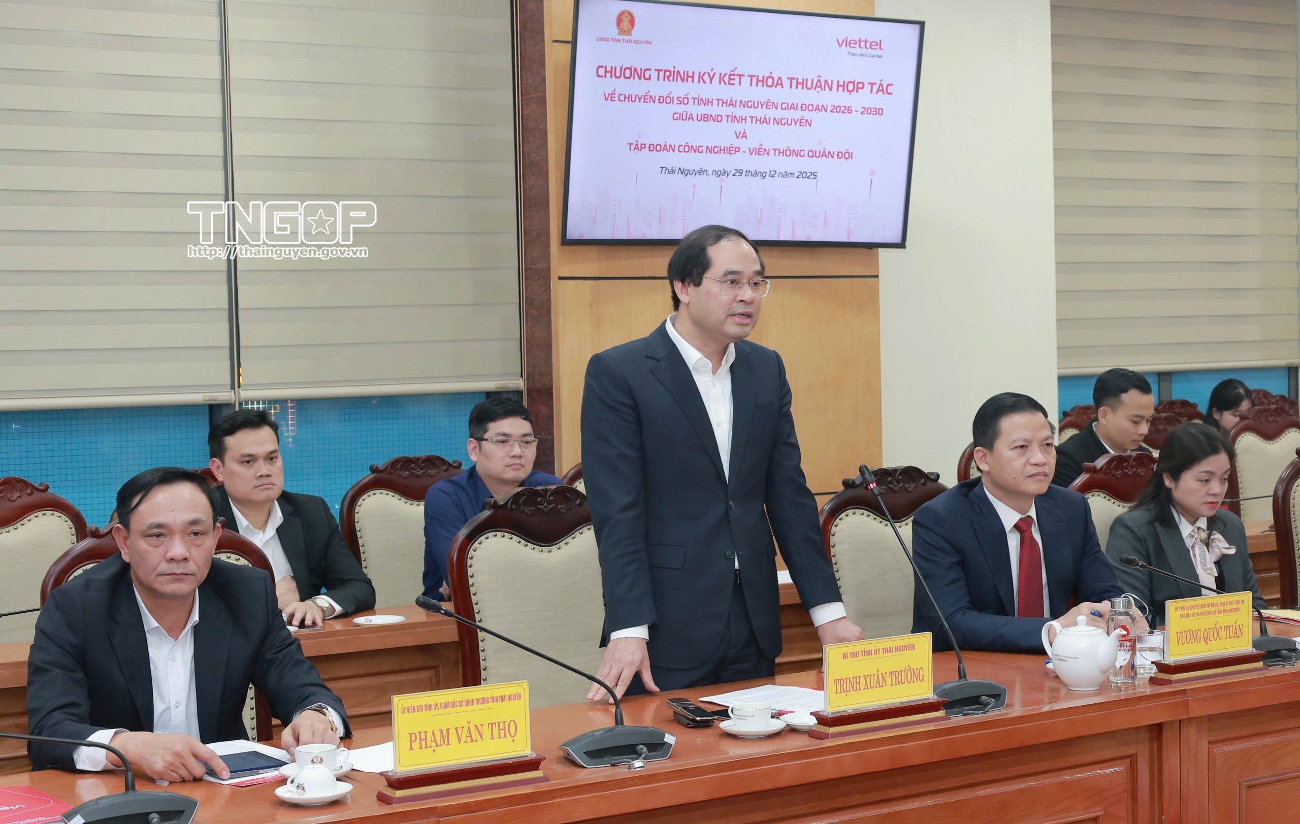 Thay mặt lãnh đạo tỉnh, đồng chí Bí thư Tỉnh ủy Trịnh Xuân Trường đánh giá cao vai trò, vị thế và năng lực của Viettel trong phát triển hạ tầng số, công nghệ số và các nền tảng phục vụ chuyển đổi số quốc gia; đồng thời ghi nhận những đóng góp thiết thực của Tập đoàn trong thời gian qua đối với tỉnh Thái Nguyên. Đồng chí Bí thư Tỉnh ủy nhấn mạnh, Chương trình ký kết Thỏa thuận hợp tác thể hiện sự thống nhất cao về định hướng, mục tiêu và nội dung phối hợp giữa hai bên trong giai đoạn 2026 - 2030; là cơ sở để tăng cường phối hợp chặt chẽ hơn, triển khai các nhiệm vụ chuyển đổi số một cách bài bản, có trọng tâm, trọng điểm, gắn với yêu cầu phát triển thực tiễn của tỉnh. Tỉnh Thái Nguyên tin tưởng, với tầm nhìn chiến lược, năng lực công nghệ, nguồn lực mạnh mẽ và kinh nghiệm thực tiễn phong phú, Viettel sẽ tiếp tục là đối tác quan trọng, tin cậy của tỉnh trong phối hợp xây dựng, nghiên cứu triển khai các nền tảng số, phát triển hạ tầng số, chính quyền số, kinh tế số và xã hội số; trong đó có những nội dung mới phù hợp xu thế hiện nay như nghiên cứu, đề xuất các mô hình Trung tâm logistics, hệ thống kho vận gắn với các giải pháp bưu chính thông minh. Về phía tỉnh Thái Nguyên cam kết tạo điều kiện thuận lợi nhất về cơ chế, chính sách, môi trường đầu tư; đồng hành, phối hợp chặt chẽ với Tập đoàn Viettel trong quá trình tổ chức thực hiện, nhằm bảo đảm các nội dung hợp tác đạt kết quả cao nhất.