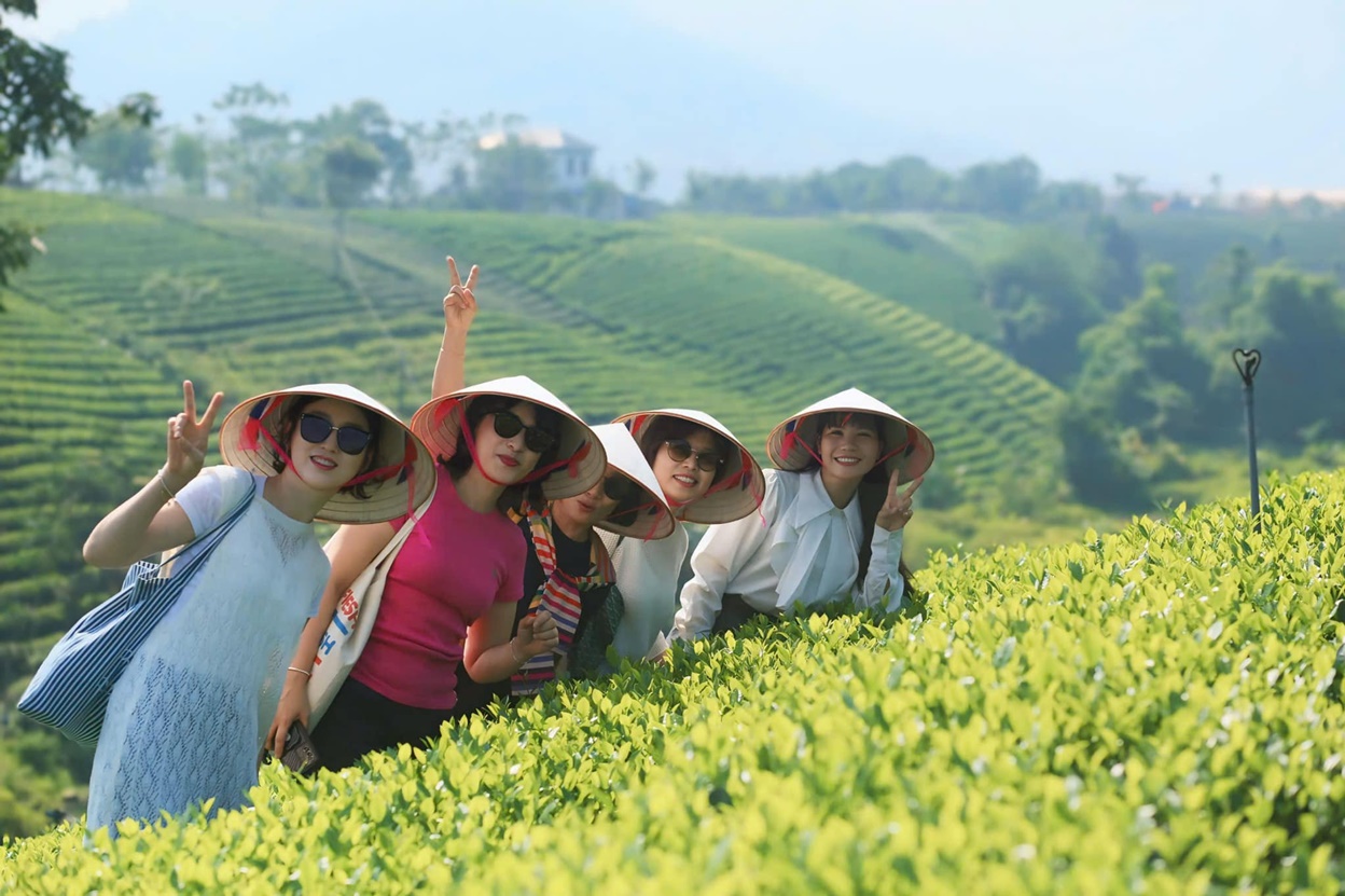 Chị Bùi Thị Mai (đứng đầu tiên từ phải sang) cùng du khách trải nghiệm tại vùng chè La Bằng - vùng đất cảm hứng cho Dự án “Trà Cánh hạc Bạch Vân - Trà sinh thái gắn với du lịch trải nghiệm” của Hợp tác xã Mây Sườn Đông
