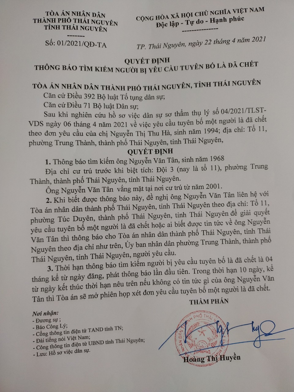 Ngày 22/4/2021 Tòa án nhân dân thành phố Thái Nguyên đã ban hành Quyết định số 01/2021/QĐ-TA thông báo tìm kiếm người bị yêu cầu tuyên bố đã chết, cụ thể như sau: